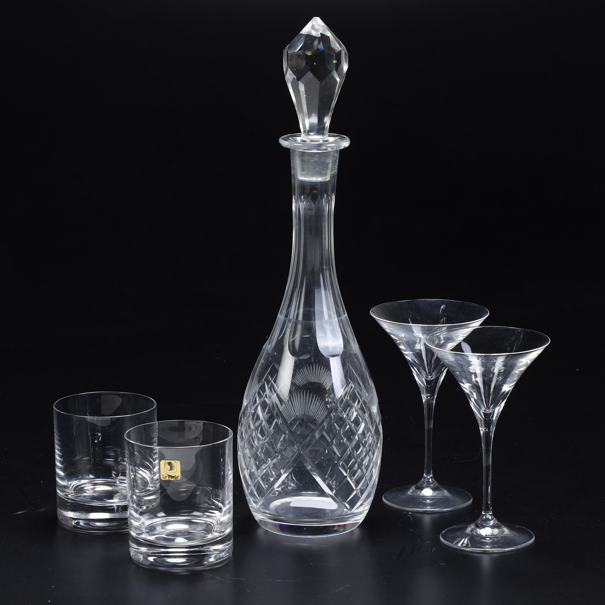 Il lotto è così composto: 10 tumbler (altezza cm 9,4); 12 calici da cocktail (altezza cm 15,8); 1 bottiglia con tappo.
