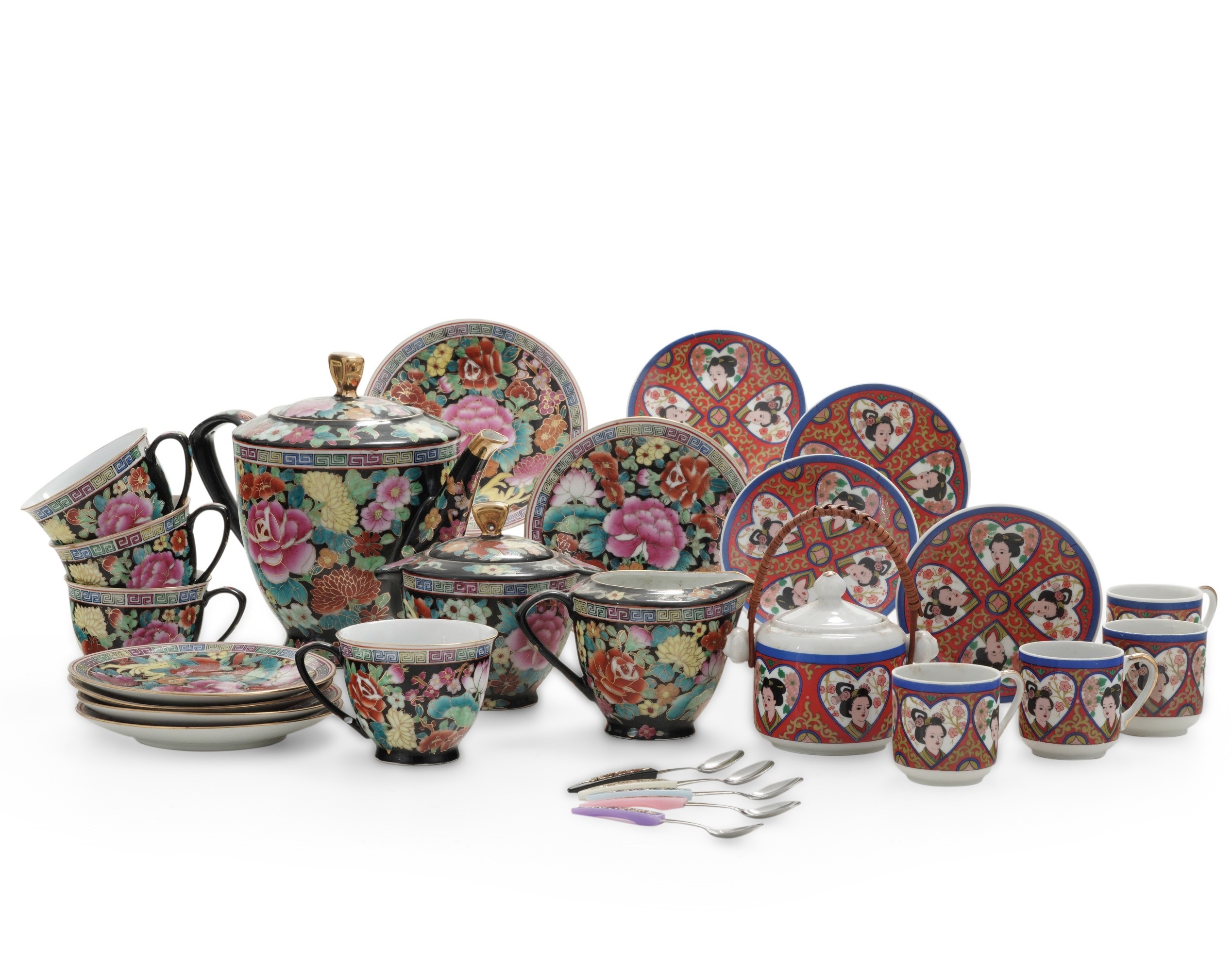 Il lotto a fondo rosso e riserve con geishe è così composto: 6 tazze da caffè con piattino; 1 zuccheriera, 6 cucchiaini in metallo.