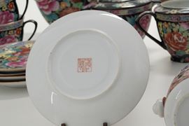 Il lotto a fondo nero e motivi floreali è così composto: 6 tazze da tè con piattino; 1 teiera; 1 lattiera; 1 zuccheriera.