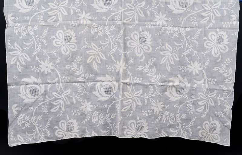 Tulle e raso, lino e ricami a motivi floreali e vegetali. Dimensioni: tovaglia tulle e raso cm 105,5x104,5; tovaglia in lino e ricami cm 107x106. Conservazione: lievi macchie brune.