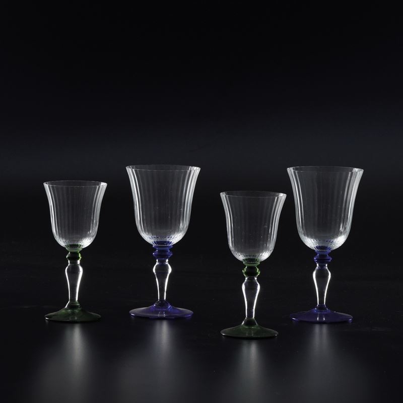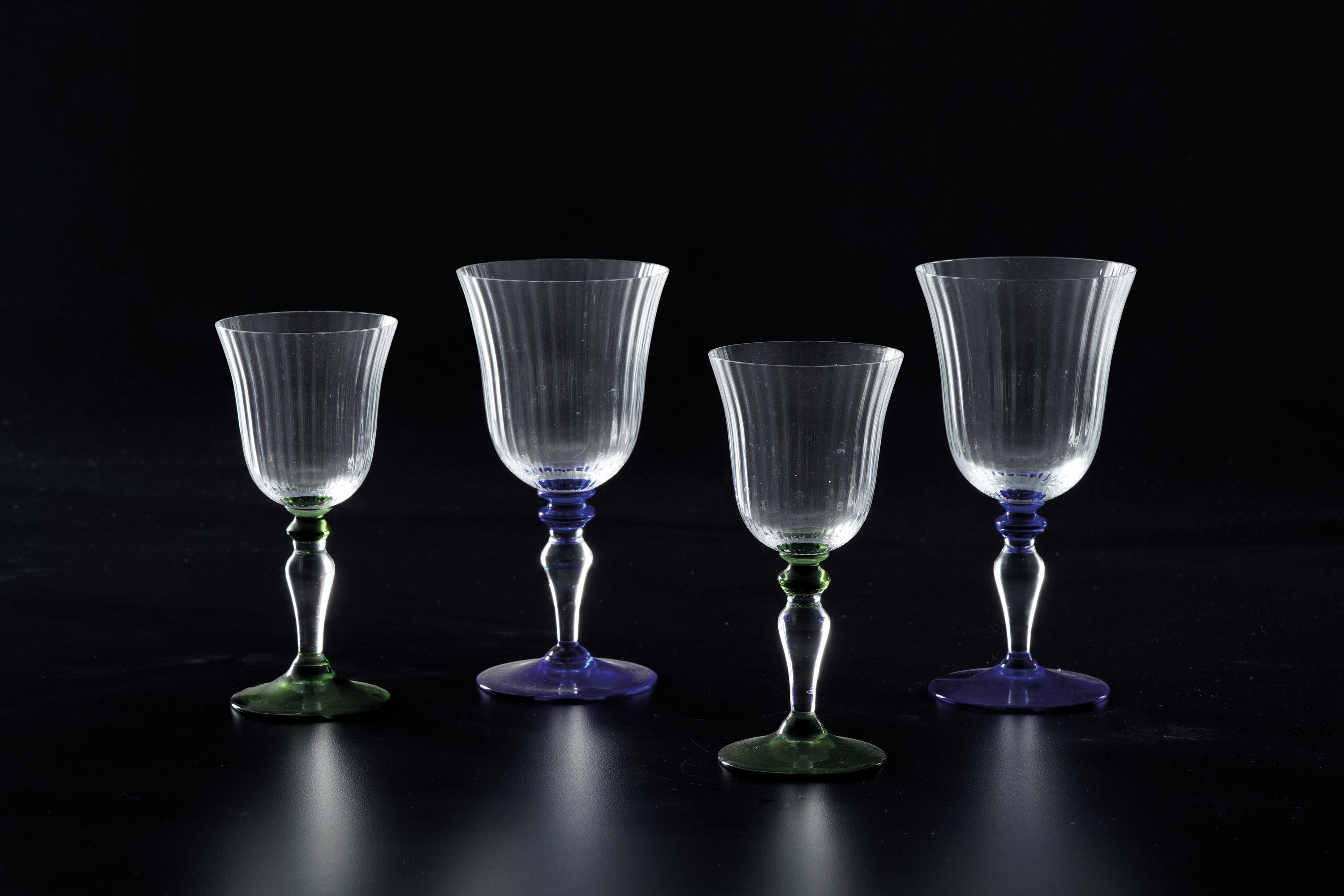Al lotto si aggiungono: 2 calici da vino blu; 4 calici da vino bianco; 1 calice da acqua verde; 2 calici da vino verdi con piccola sbeccatura al bordo superiore.