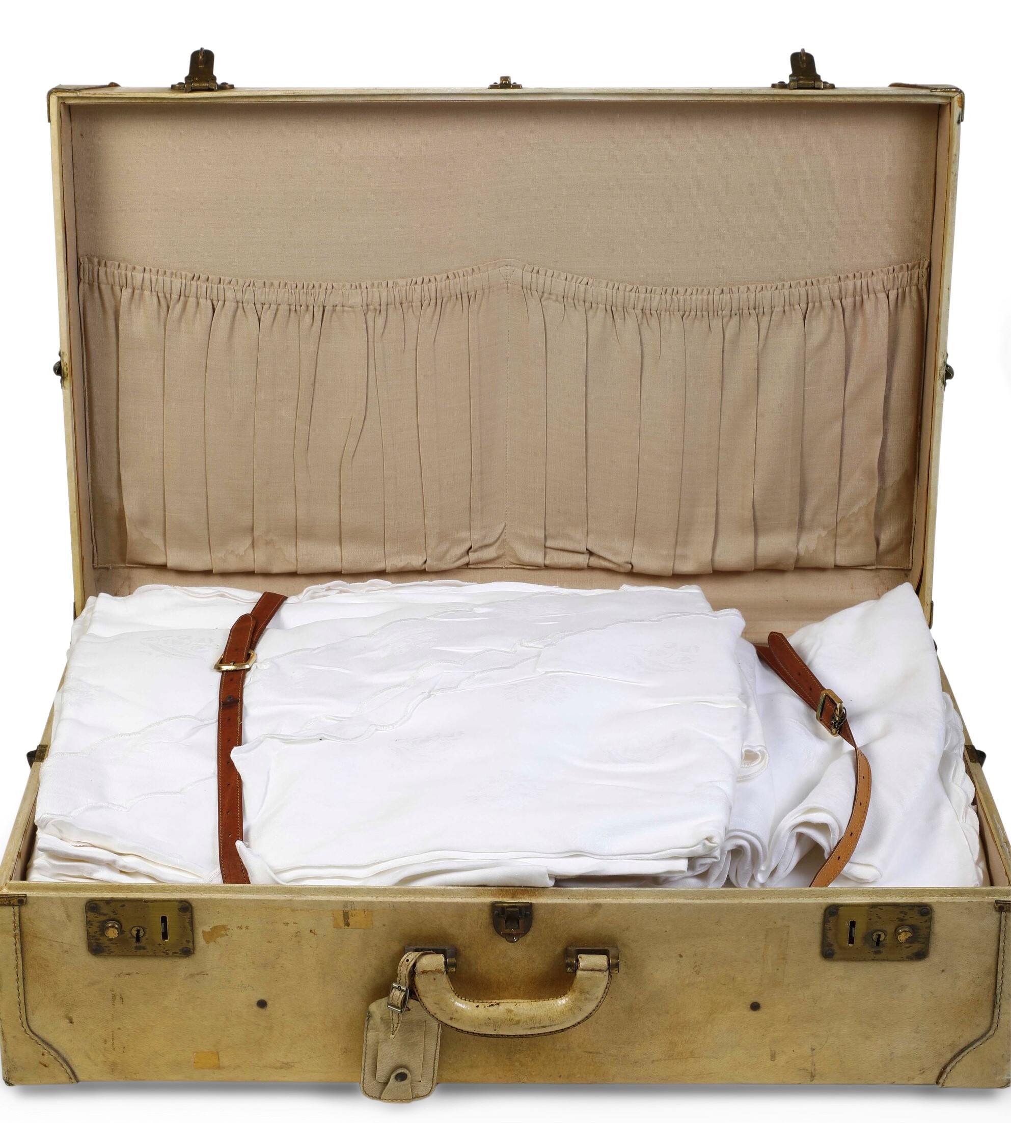 Il lotto è così composto: 8 tovaglie rotonde con 12 tovaglioli cadauna (dimensione massima: cm 180); 5 tovaglie rotonde senza tovaglioli; 1 tovaglia rettangolare (dimensioni: cm 279x126).