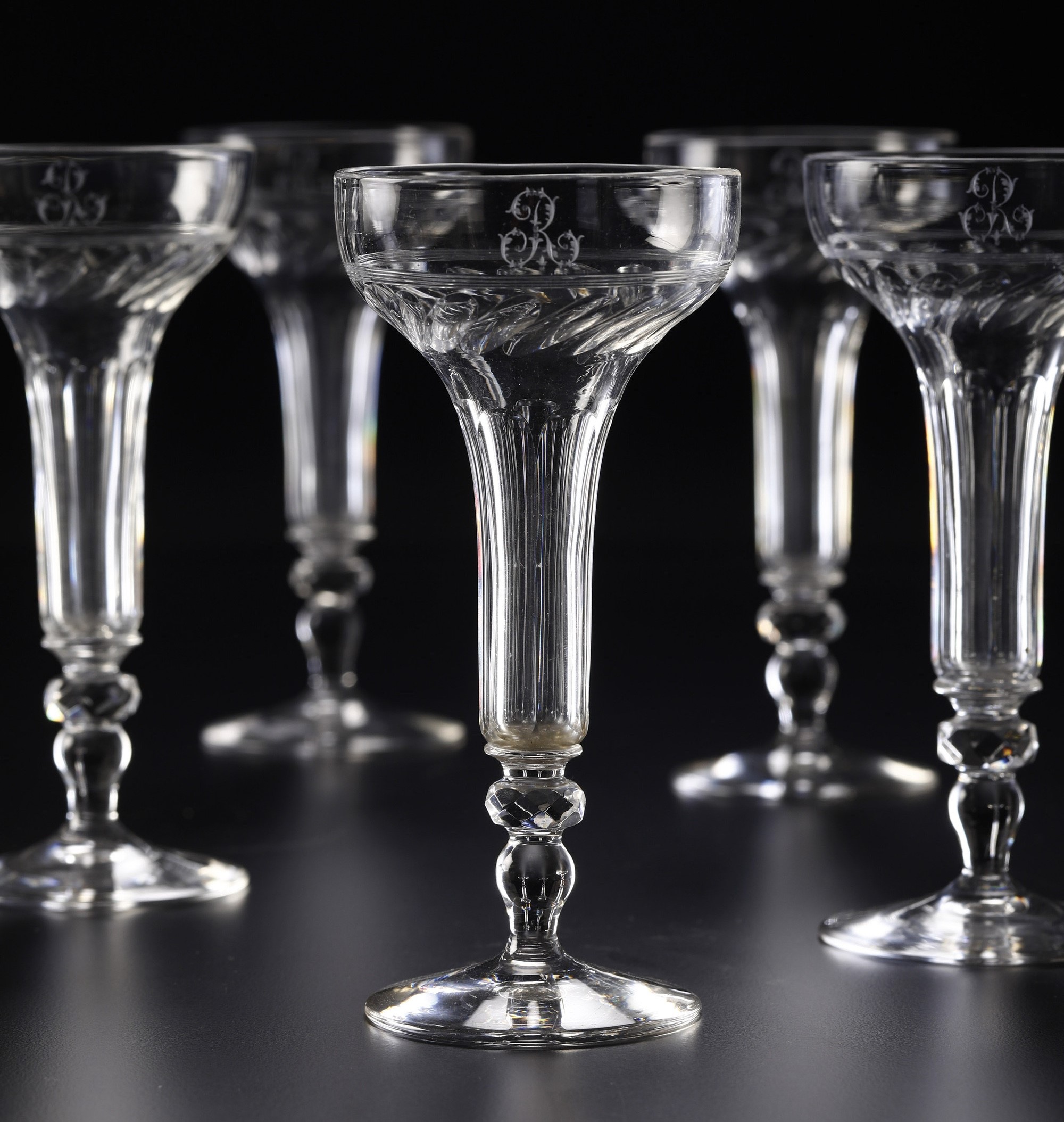 Nove coppe da champagne con monogramma “R”, 1920 circa.