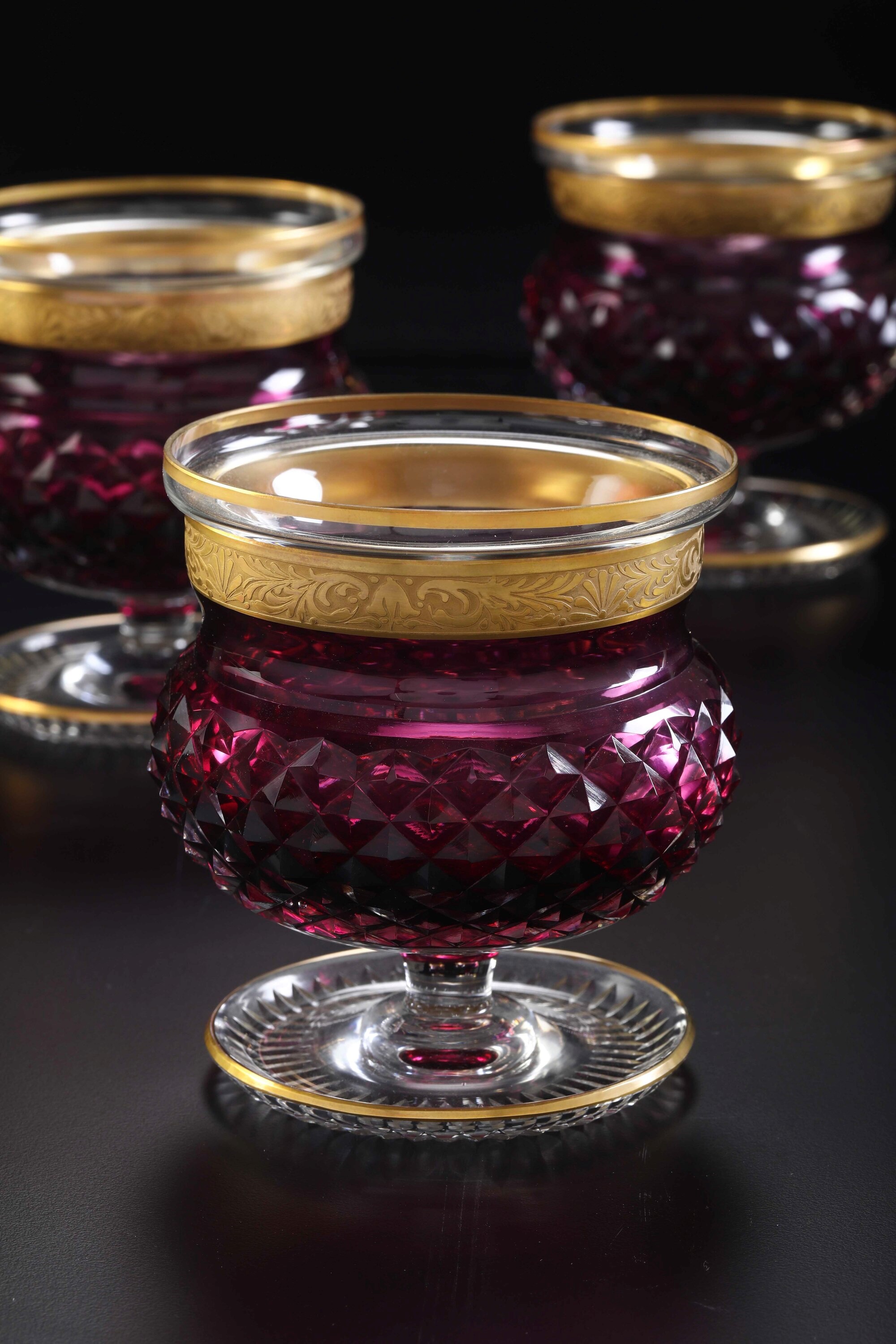 Cristallo trasparente e color porpora con fascia a motivi vegetali in oro. Marca: assente. Altezza cm 14,5. Conservazione: ottima.