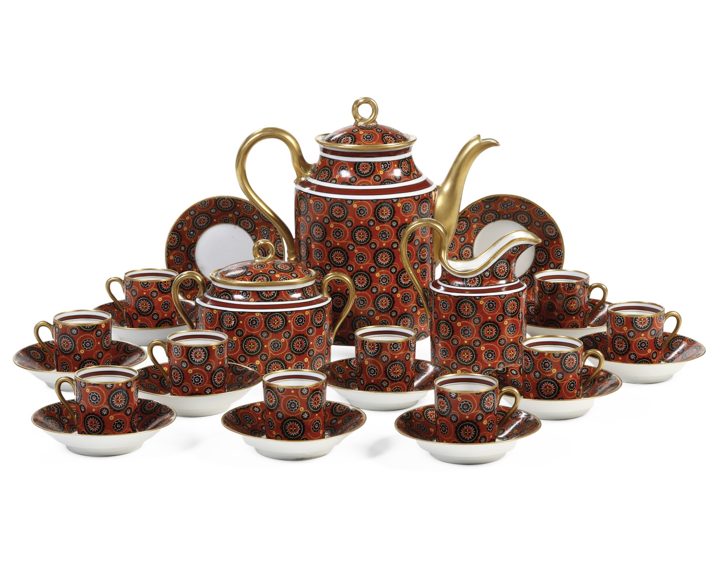 Le tazze hanno forma cilindrica con piattino troncoconico. La policromia vede le superfici esterne decorate a motivi circolari geometrici forse a rappresentare dei fiori estremamente stilizzati su fondo rosso ferro nei colori giallo, rosso ferro, bianco e nero. Inoltre profilature, manici, prese e beccuccio della caffettiera in oro.