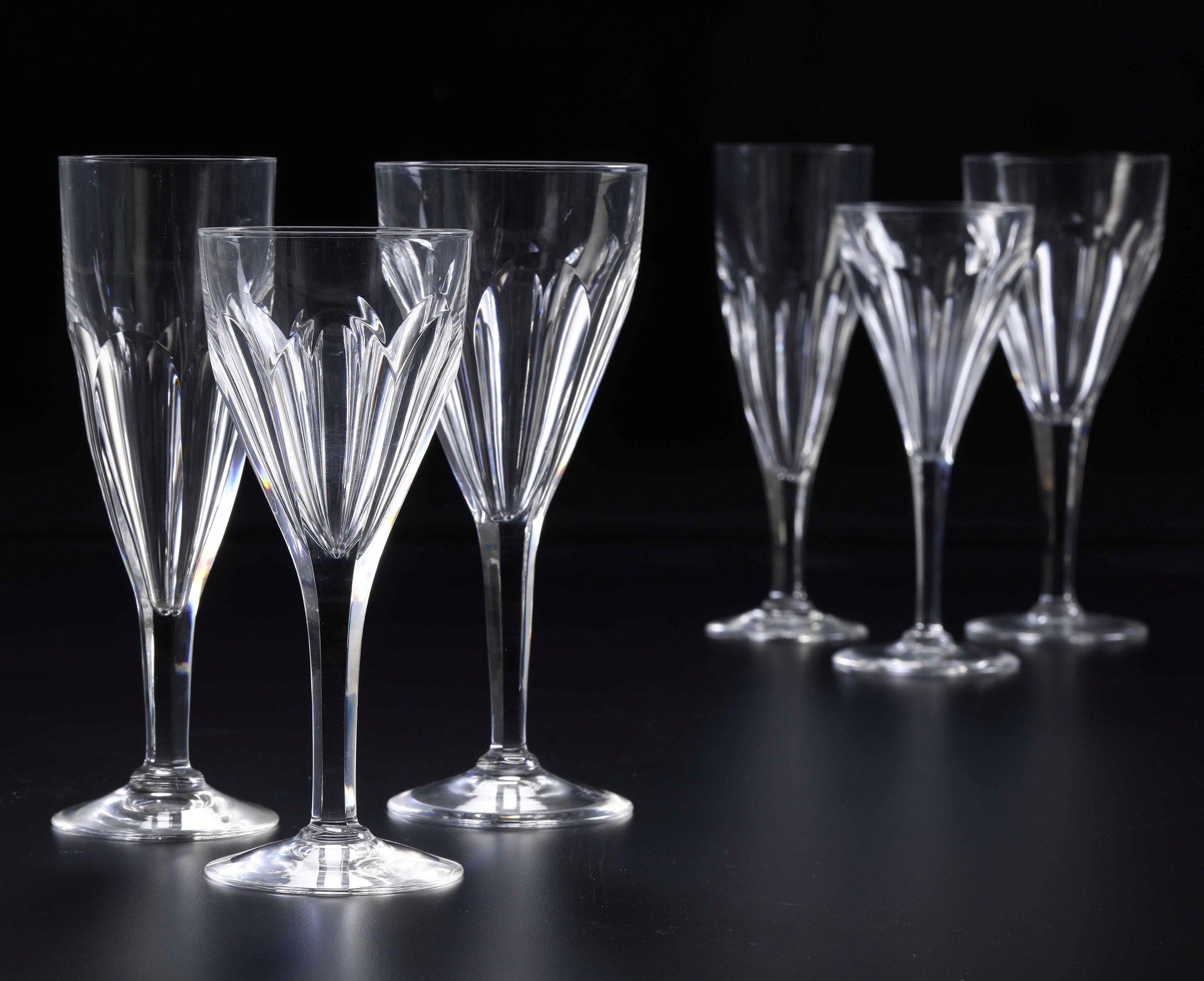 Cristallo. Marca: "Boda inciso" Conservazione: due calici da acqua e due flûtes con sbeccatura al bordo superiore.