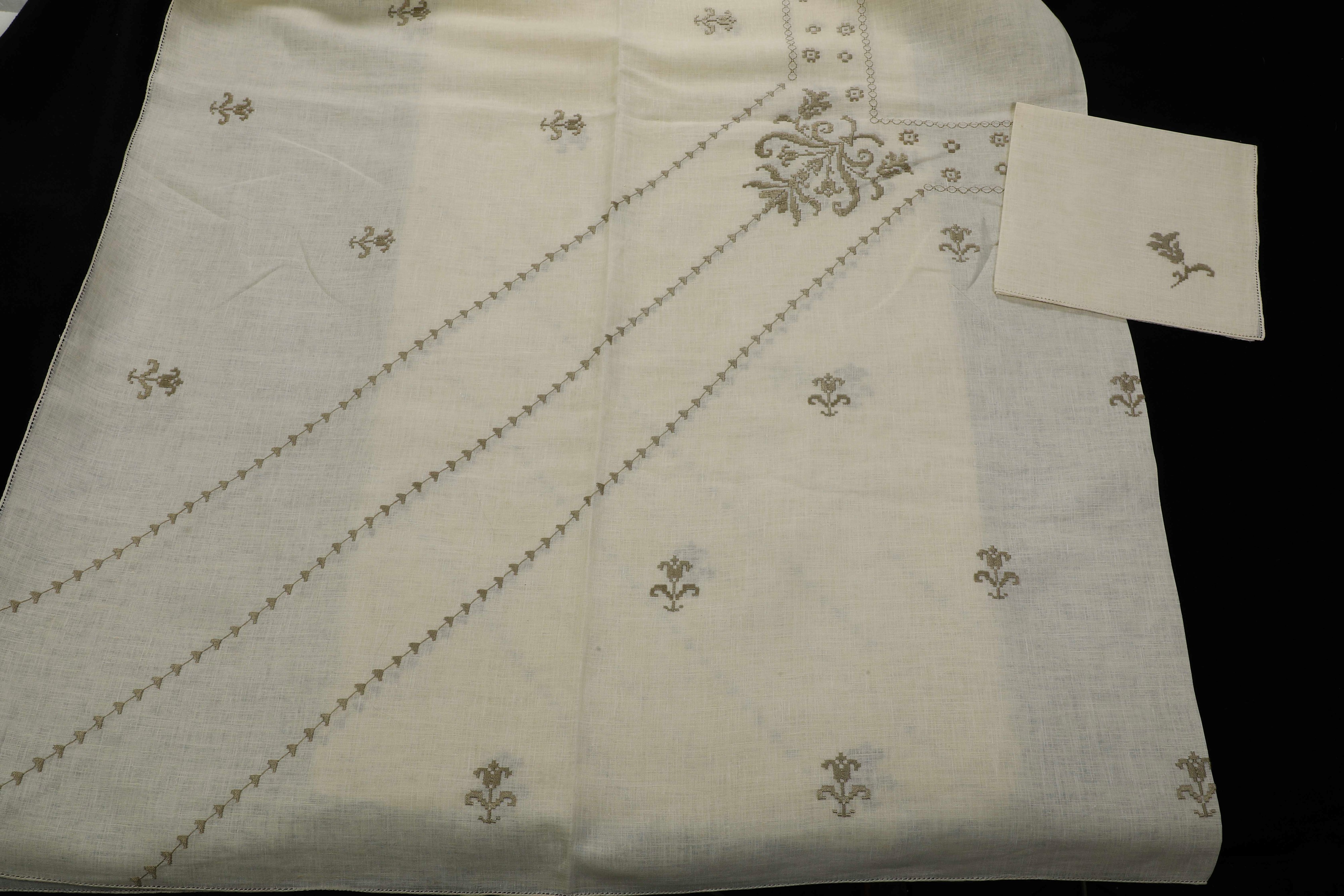 Lino color avorio e piccoli ricami in filo grigio perla. Dimensioni: tovaglia cm 133x257; 12 tovaglioli cm 42x42; 12 tovagliolini cm 21x21. Conservazione: piccole macchie su tre tovaglioli.