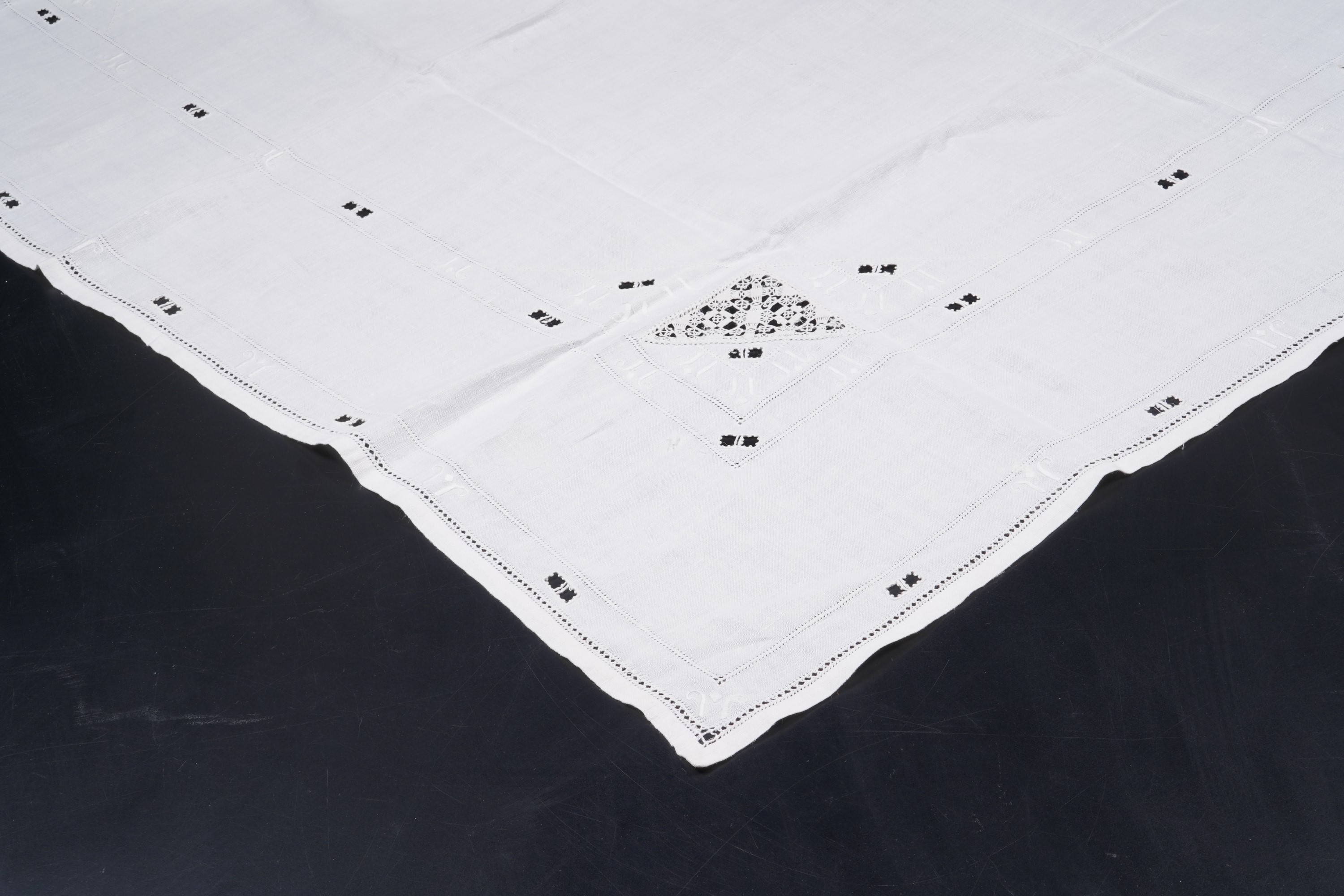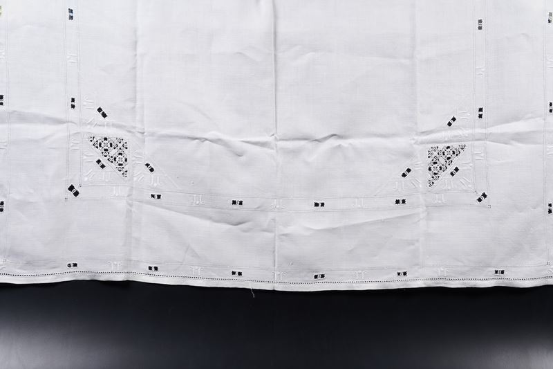 Lino e inserti a ricamo. Dimensioni: cm 127x132. Conservazione: ottima; insignificanti bruniture e scuciture.
