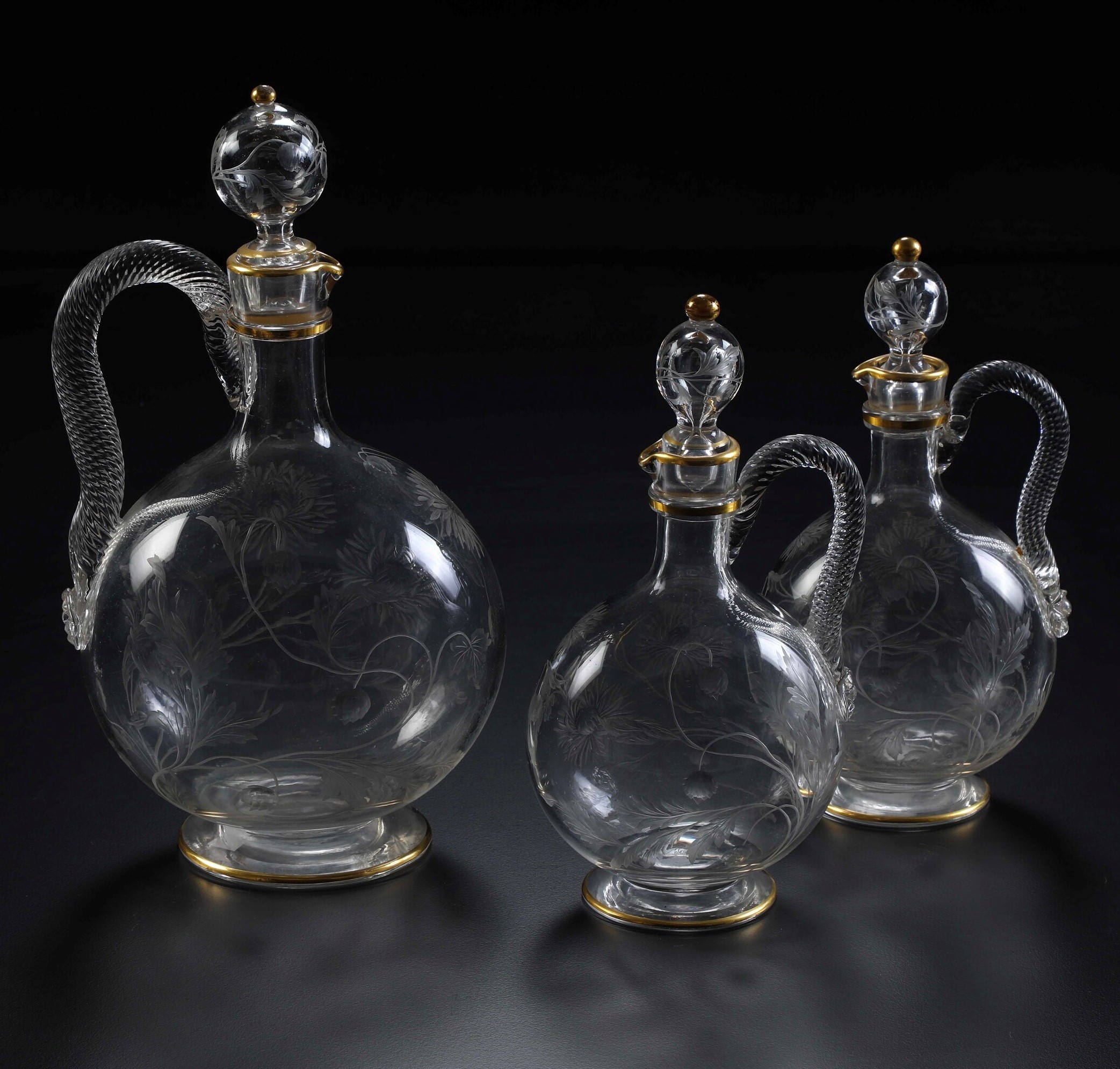 Cristallo con decorazioni floreali incise alla mola. Altezze: cm 25,2; cm 19,5; cm 19,5 circa. Conservazione: ottima.
