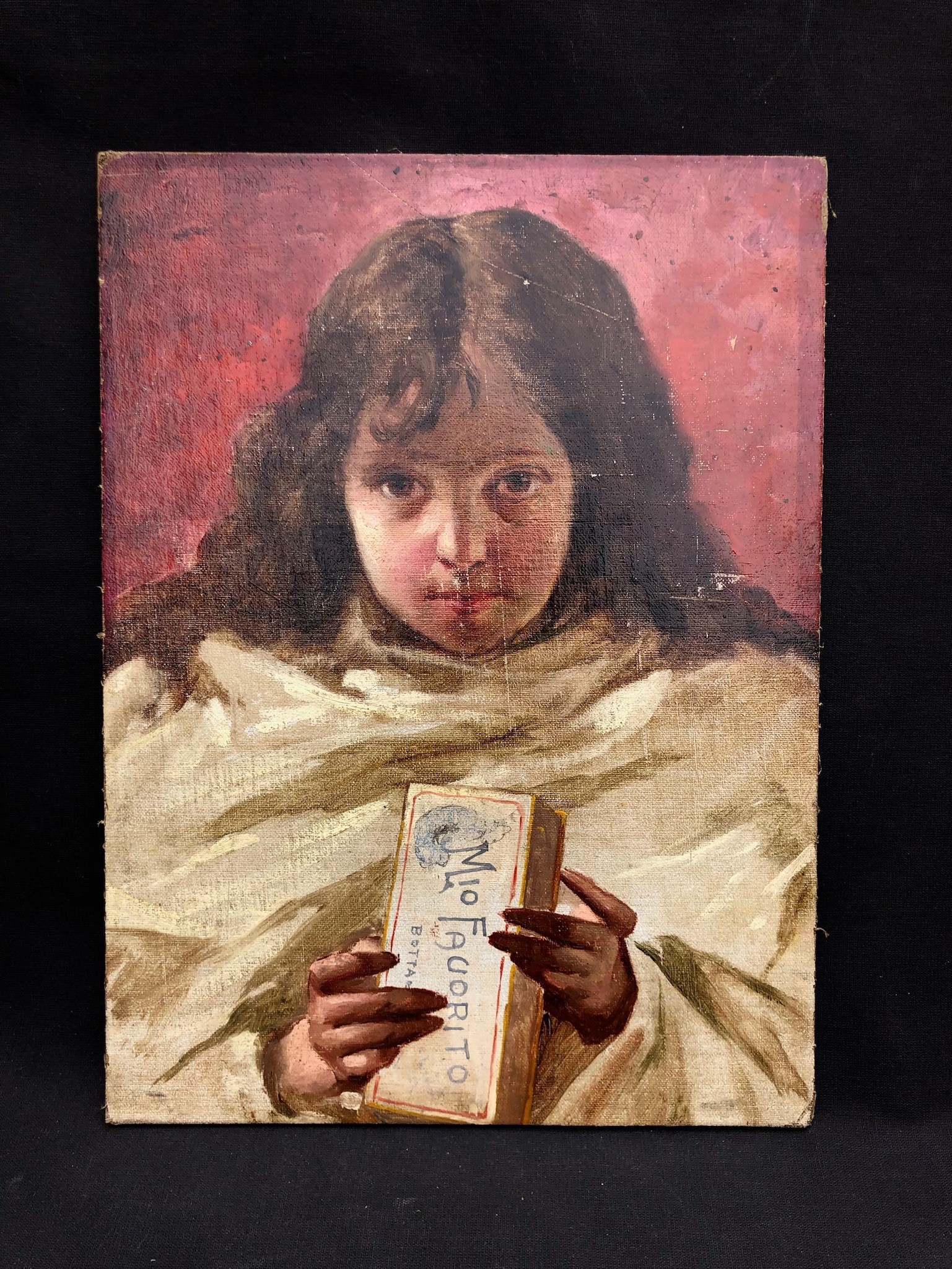 Olio su tela riportata su cartone raffigurante una bambina che tiene in mano una scatola del prodotto reclamizzato.