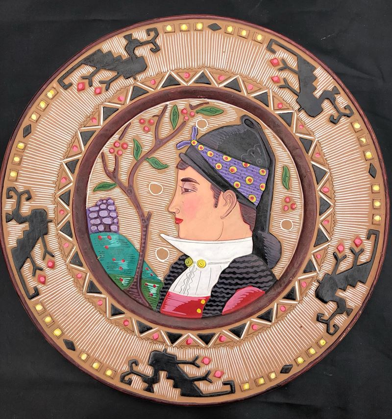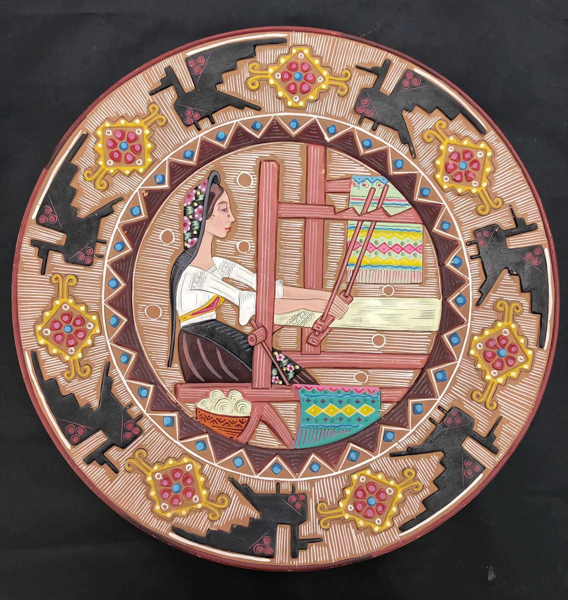 DUE PIATTI SARDI IN TERRACOTTA GRAFFITA E DIPINTA, Diametri cm 35 (tessitrice) e cm 28,5