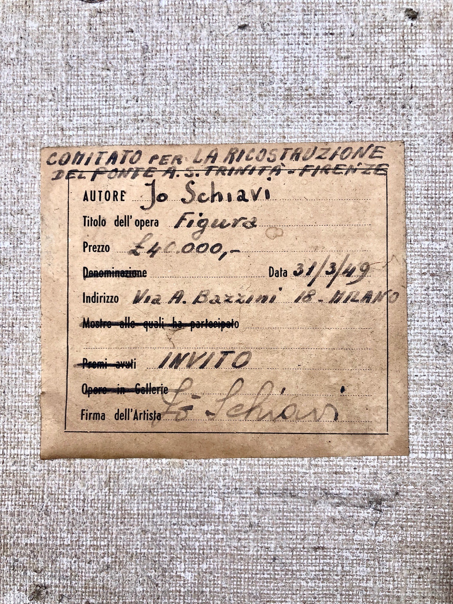 il quadro è legato alla storia di Firenze e - più in generale - a quella dei duri anni dell’Italia del dopoguerra. Come si evince infatti dall’etichetta originale che ancora si conserva sul retro della tela, l’opera fu consegnata - su invito - dalla pittrice al “Comitato per a ricostruzione del ponte a S.Trinita” distrutto dai nazisti - insieme agli altri ponti sull’Arno - il 3 agosto del 44. Alla raccolta dei fondi contribuì anche la nostra tela dal momento che i proventi della vendita erano destinati interamente alla ricostruzione. Al tempo Jolanda Schiavi (o Jo Schiavi, come amava firmarsi) era pittrice piuttosto nota e quotata. La richiesta - modesta visto lo scopo benefico a cui era destinata - di 40.000 lire (cifra che compare sull’etichetta) corrispondeva grosso modo a 1.000 euro di oggi.