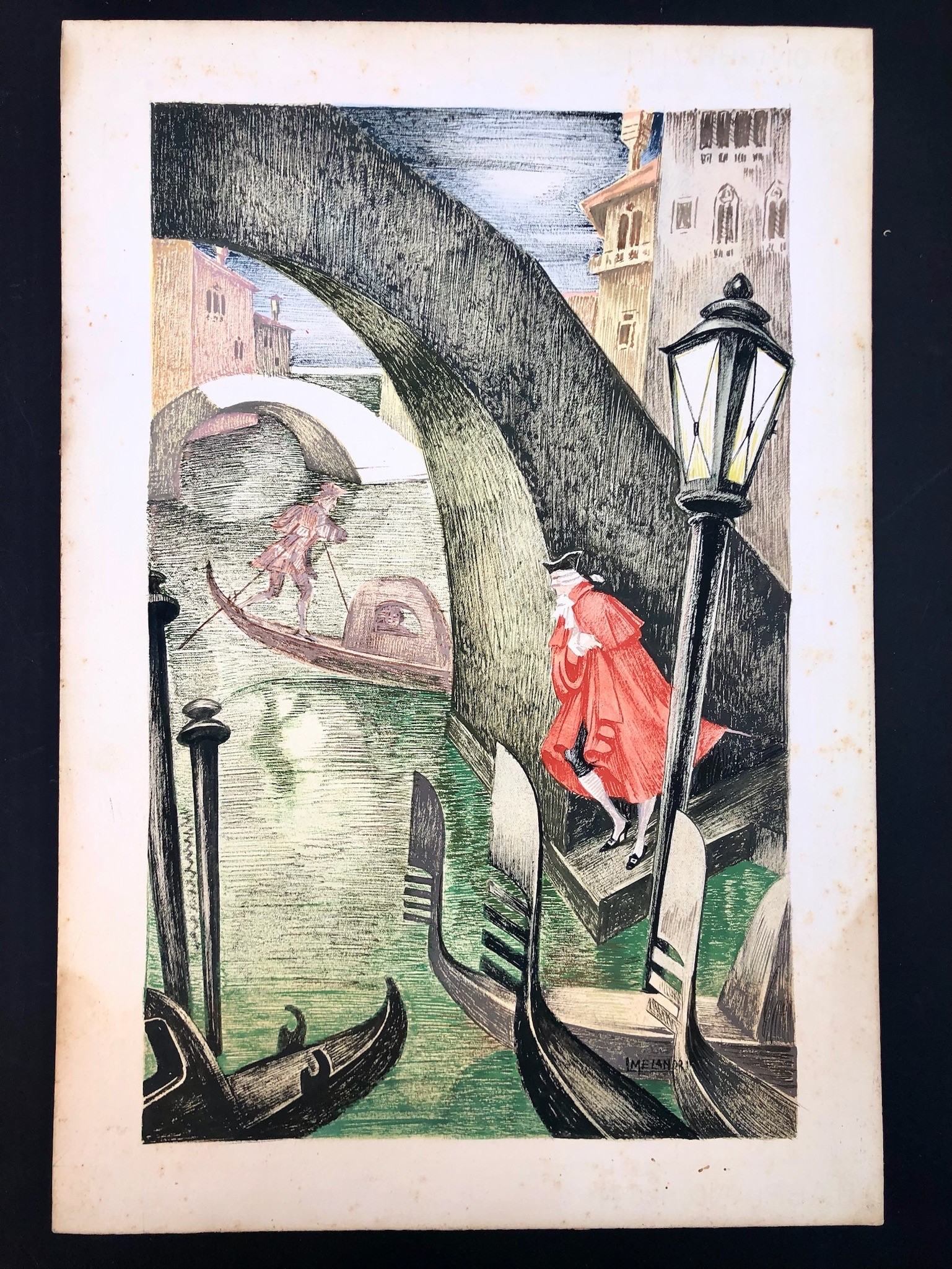 Bella e grande illustrazione di soggetto Veneziano ambientato nel 700. Il Melandri fu pittore e illustratore attivo soprattutto tra gli anni Venti e Cinquanta. Illustrò oltre 60 libri e collaborò per oltre 20 anni con il Corriere dei Piccoli. Cfr. Paola Pallottino, Storia dell’illustrazione italiana, Zanichelli pag 208, 243, 244, 251, 308, 334