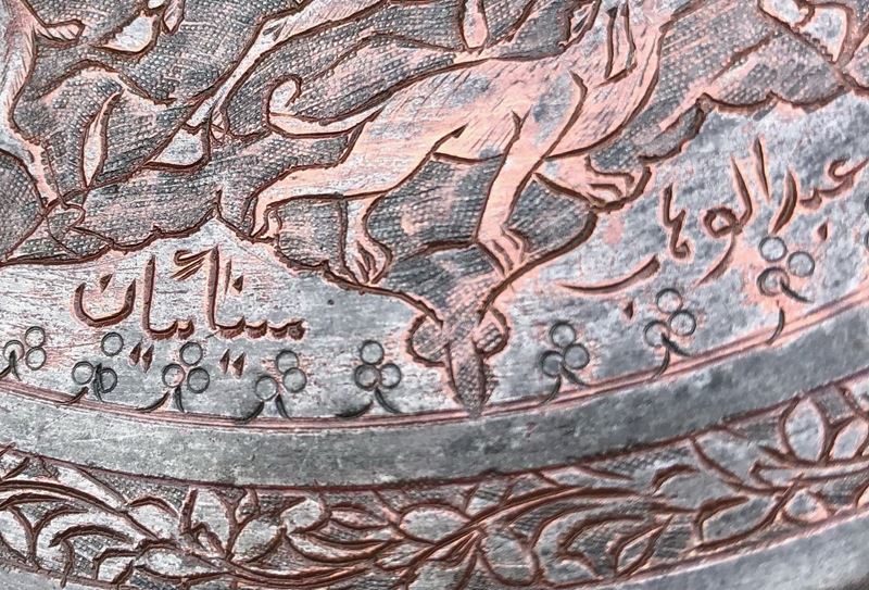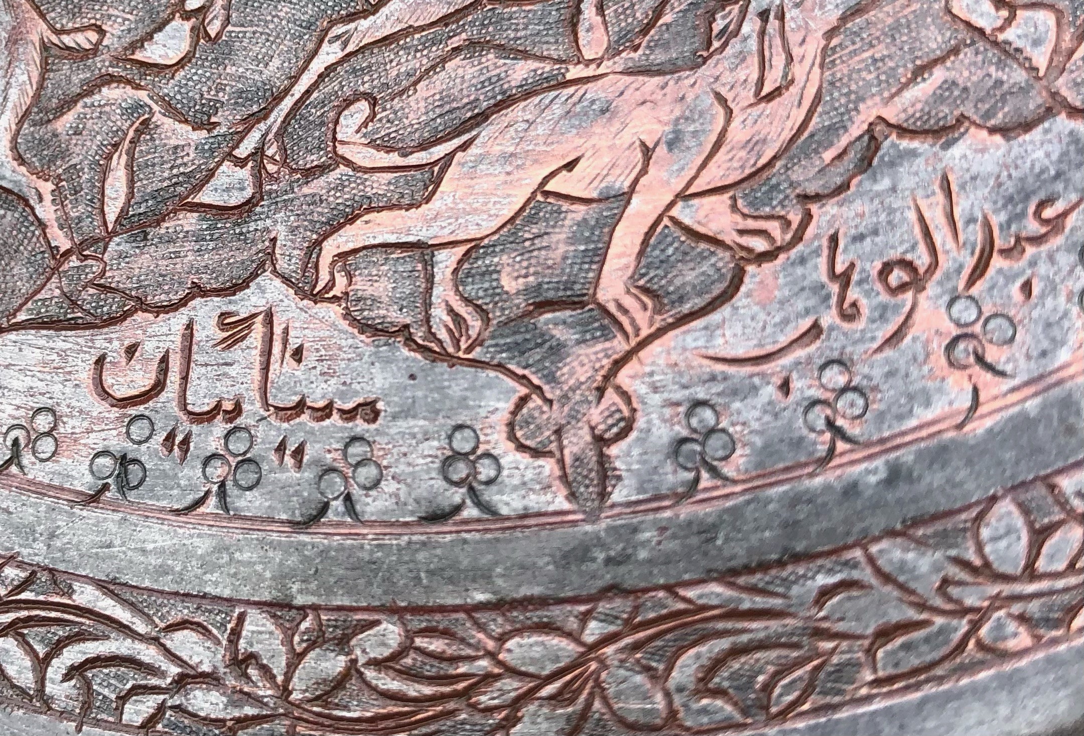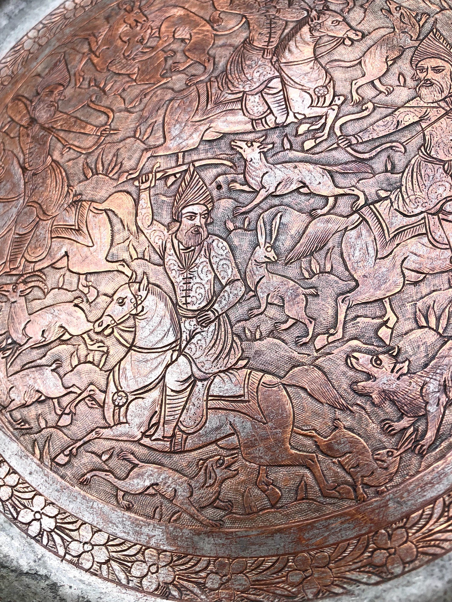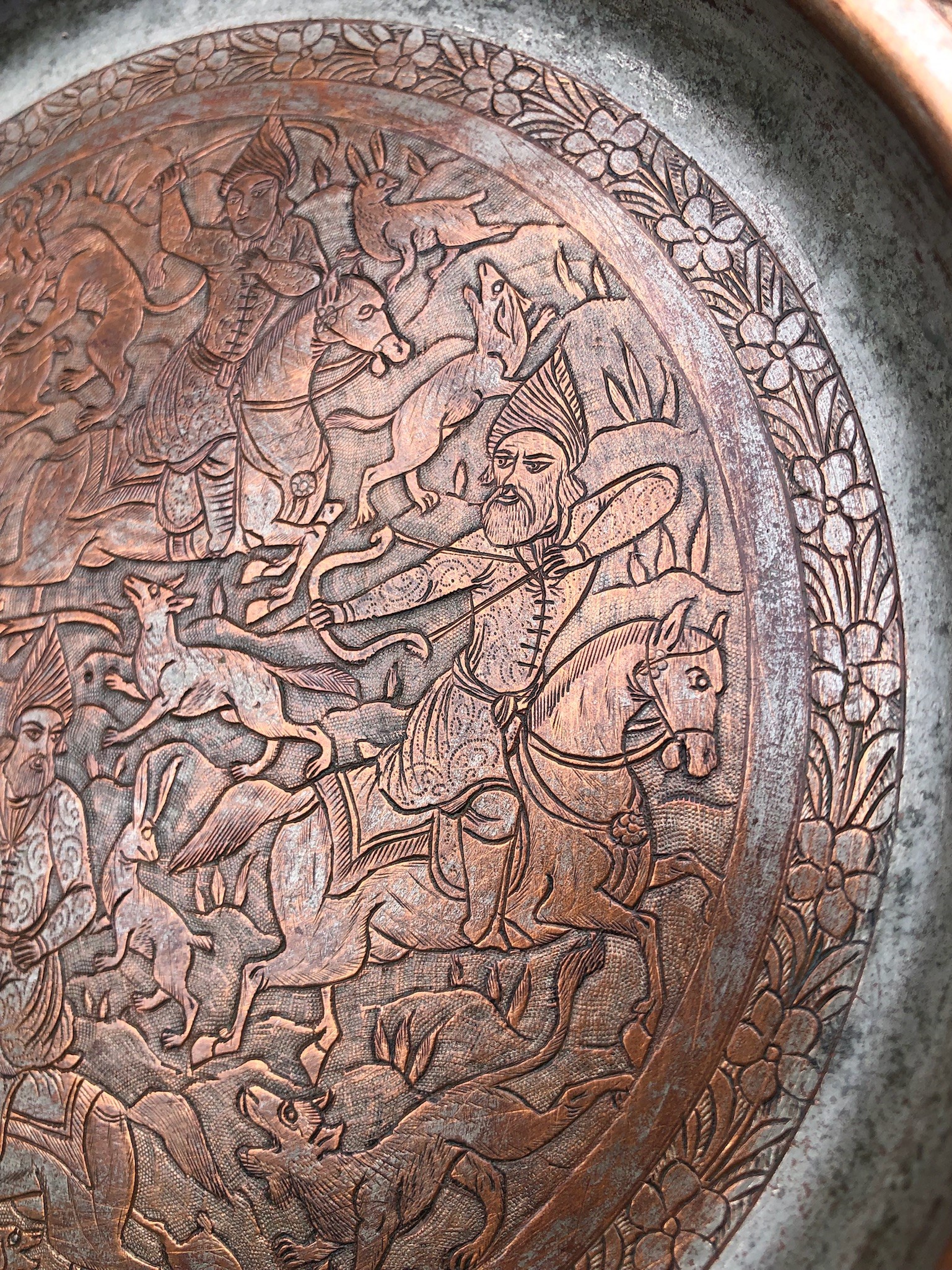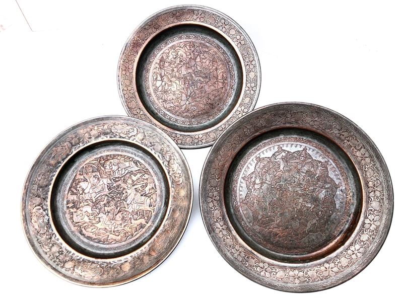 PERSIA, 3 PIATTI IN RAME ISTORIATI CON SCENE DI CACCIA, PRIMA META’ XX SECOLO
