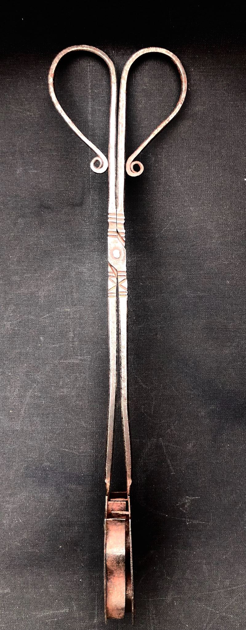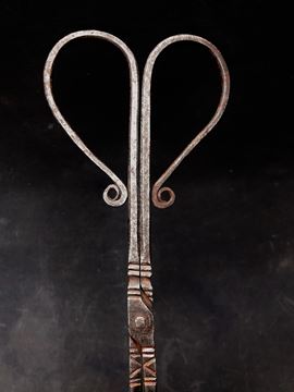 Il calamistro, usato già nell’antica Roma, trovò nel XVIII secolo il momento della sua massima applicazione. Sapientemente scaldato serviva per fare “i ricci” ai capelli. Lunghezza cm 36
