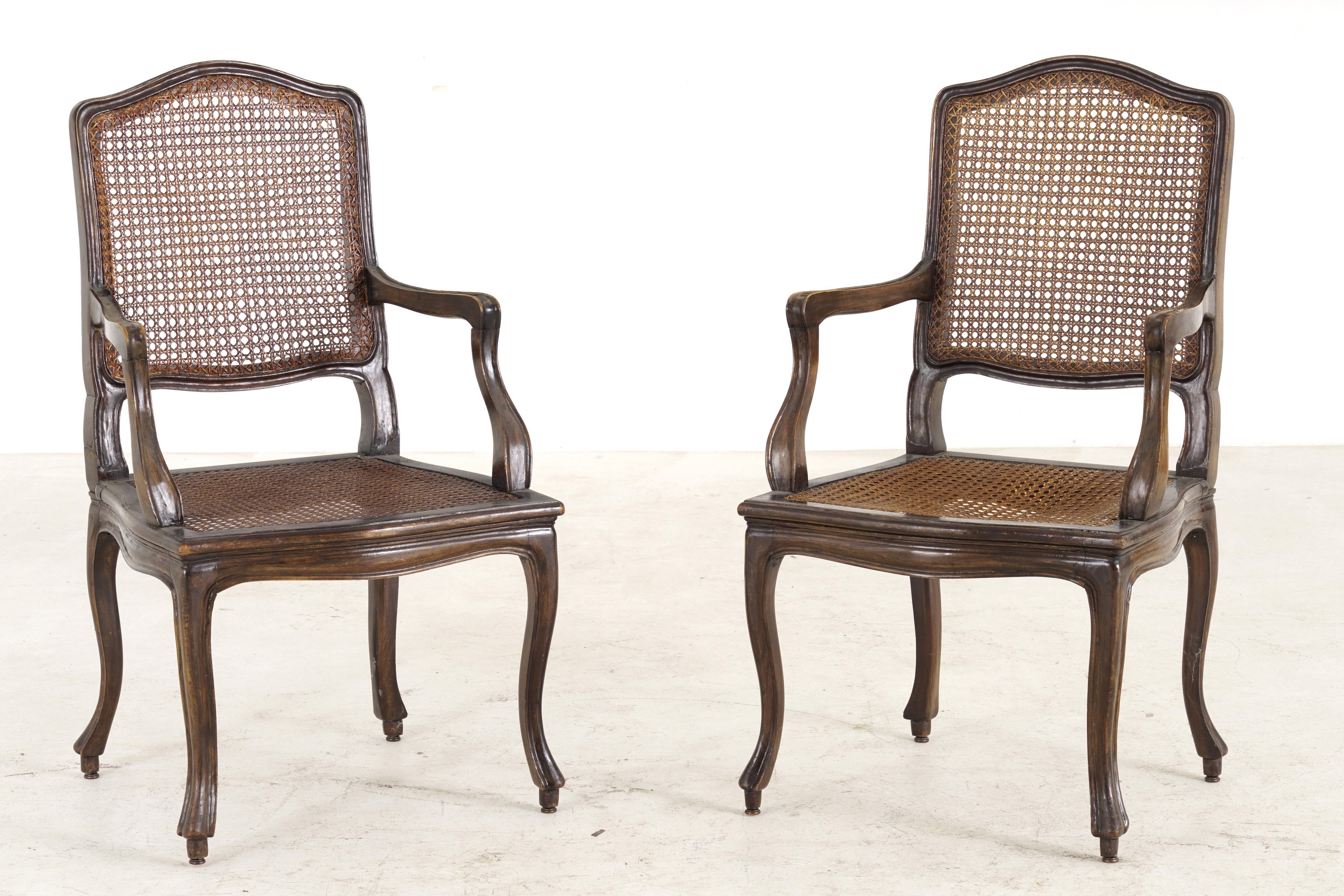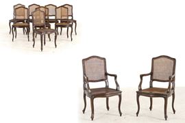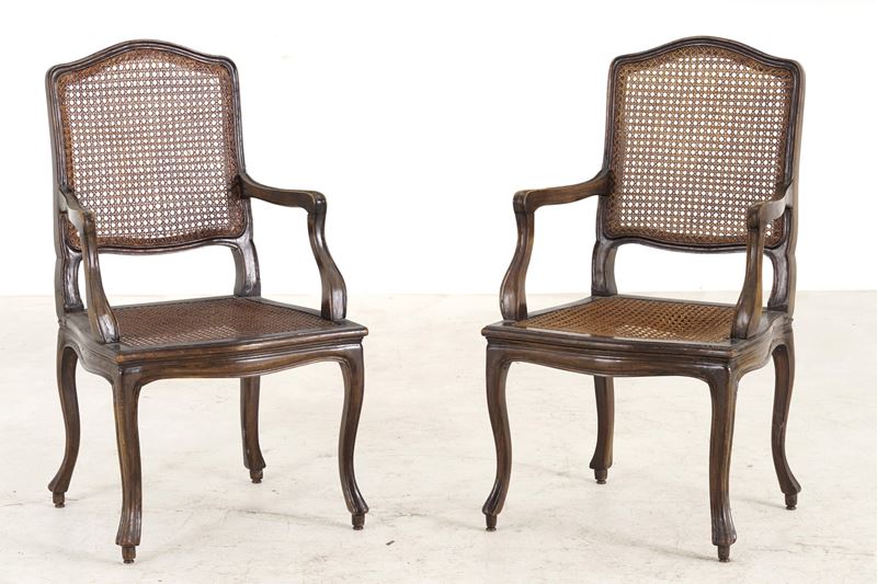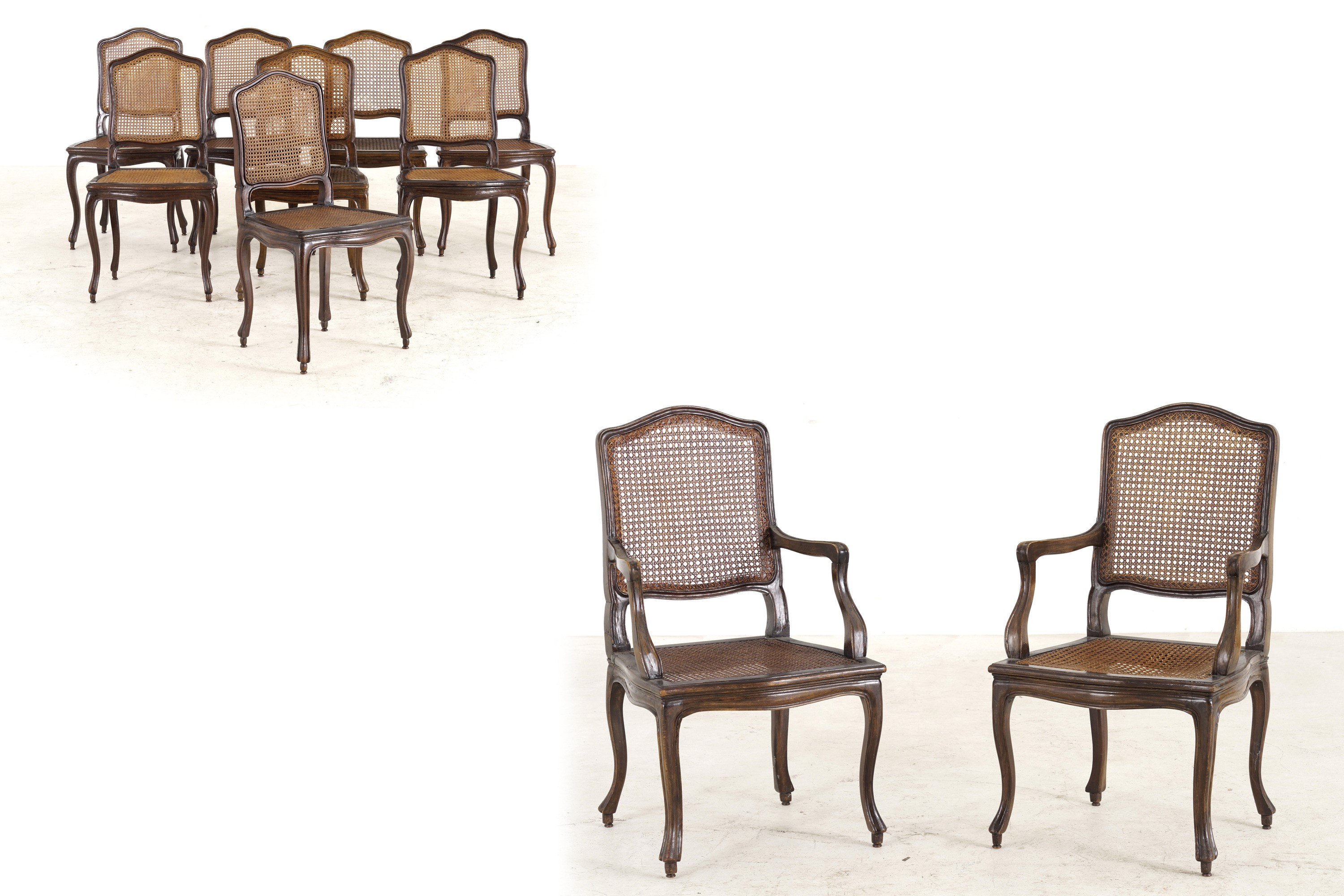 Sedute e schienali sagomati e incannucciati, gambe e braccioli mossi