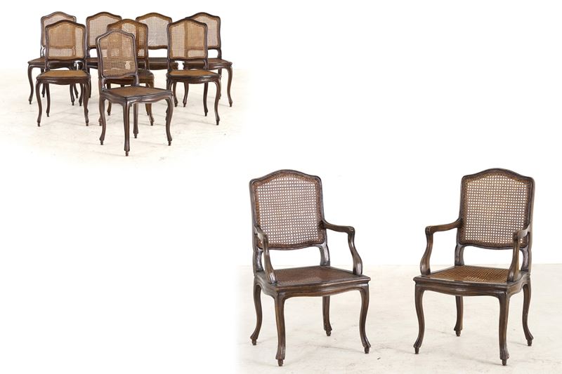 Gruppo di otto sedie e due poltrone di gusto settecentesco in legno intagliato