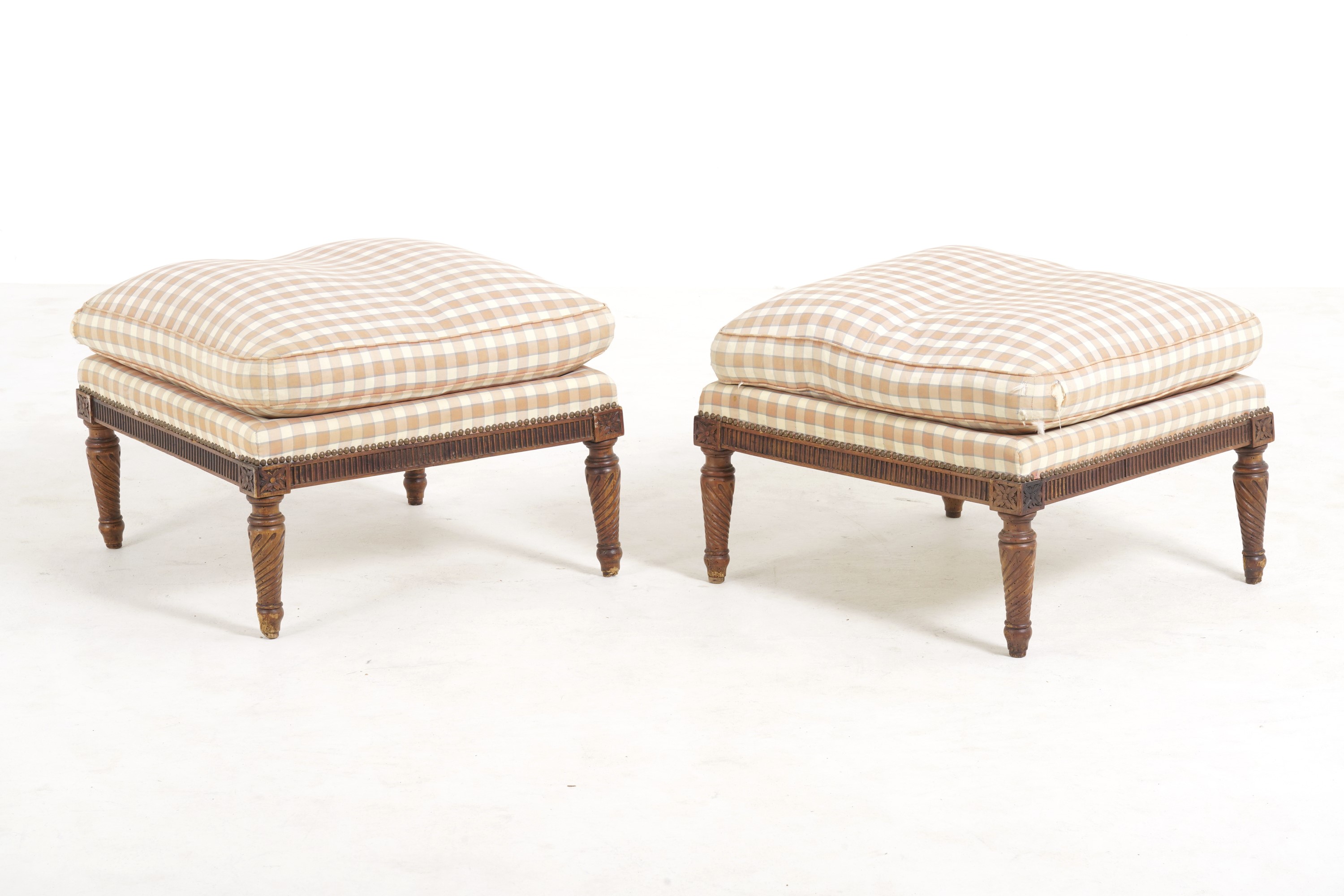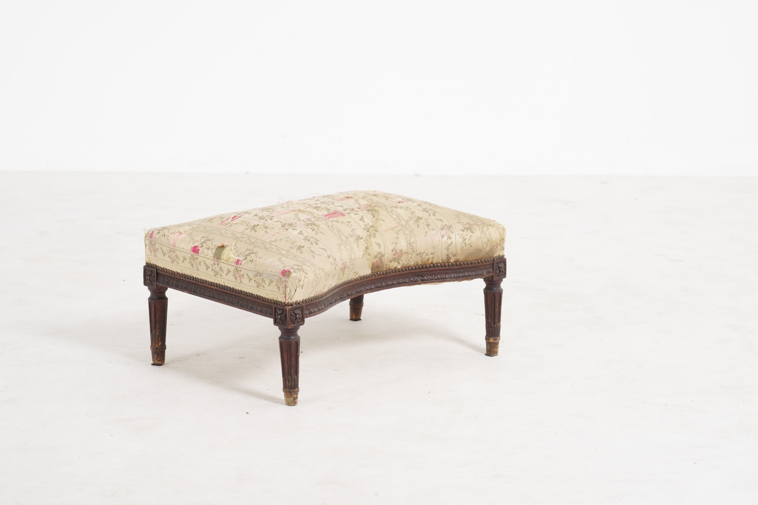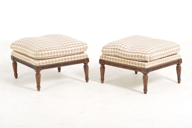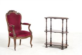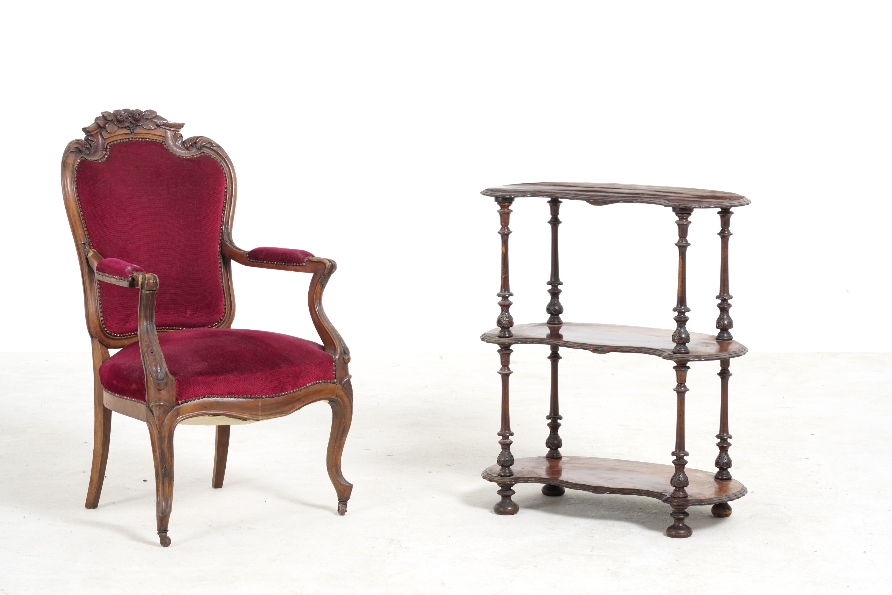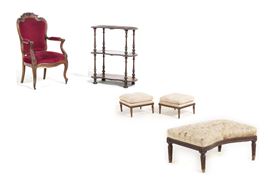 Insieme di 3 poggiapiedi intagliati, una piccola etagere e una poltrona