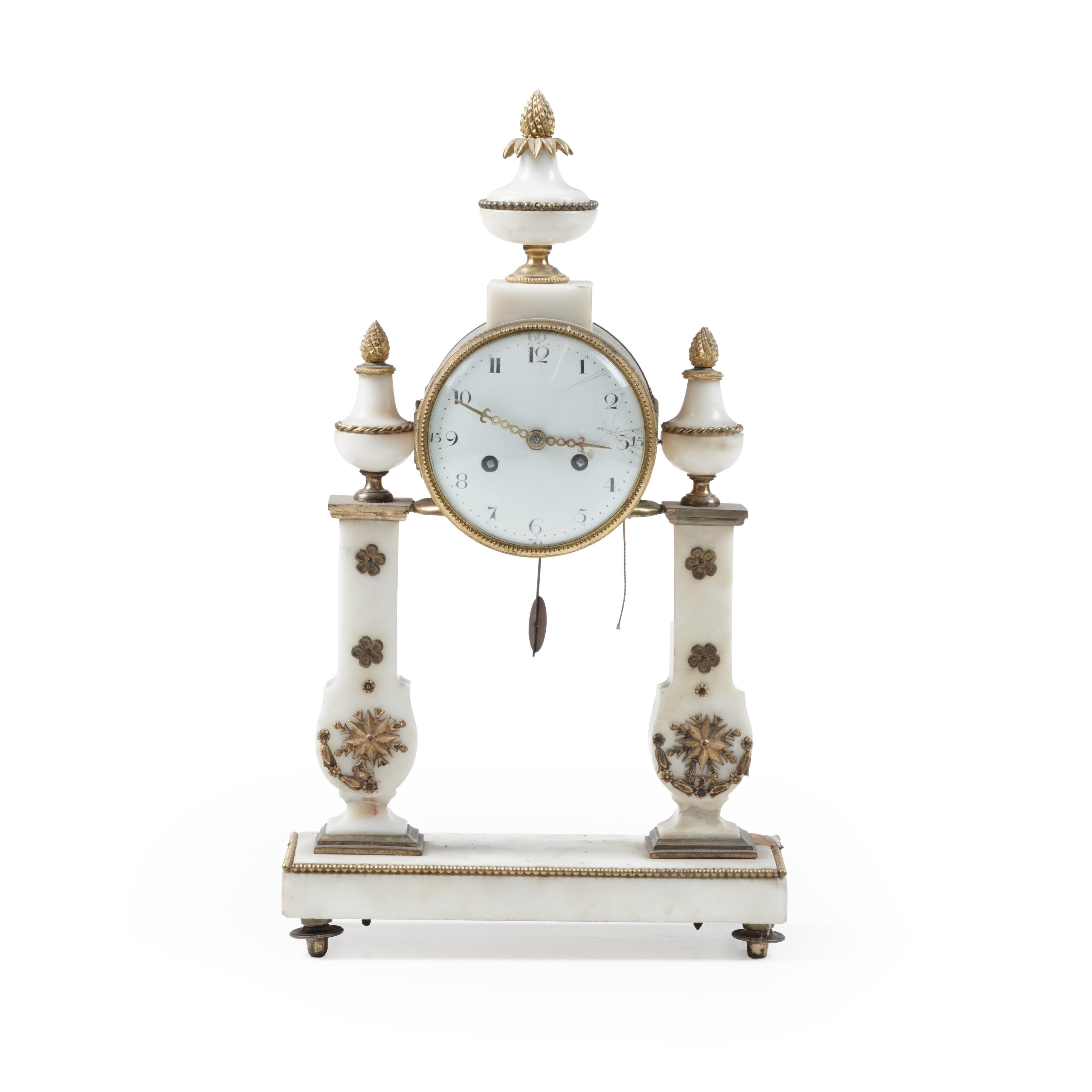 Cassa in bronzo dorato, quadrante in smalto bianco con numeri arabi. Base, sostegni e cimasa in marmo con applicazioni decorative in bronzo dorato. (difetti al quadrante)