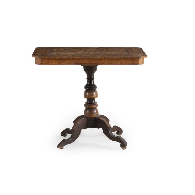 Tavolino da salotto intarsiato. Rolo, XIX secolo