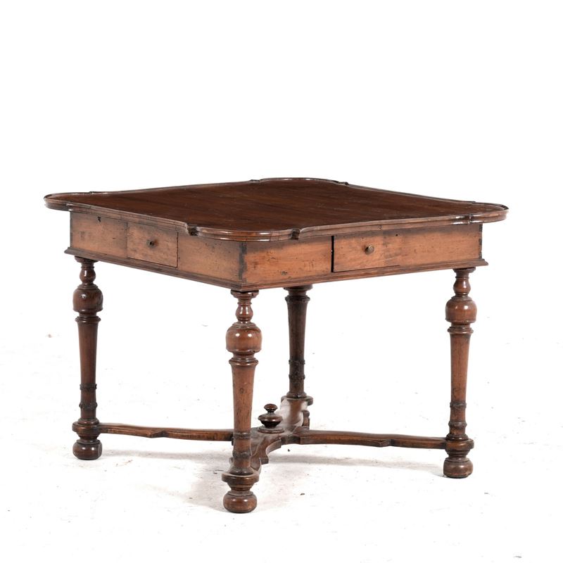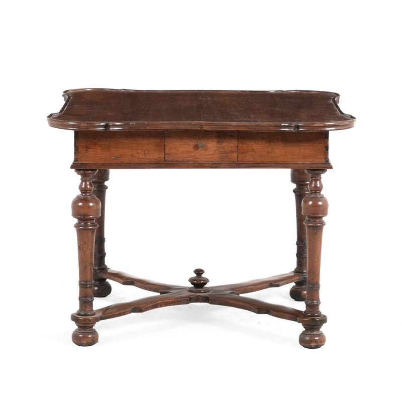 Piano sagomato, un cassettino nella fascia, gambe riunite da traverse mosse