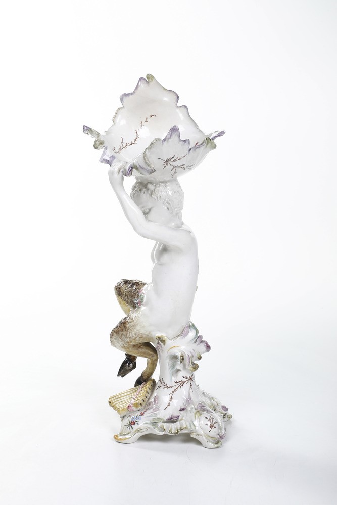 Su base a rocailles vegetali poggia un giovane fauno che tiene sulla testa una bacinella a forma di foglia. Ai suoi piedi un flauto di Pan.