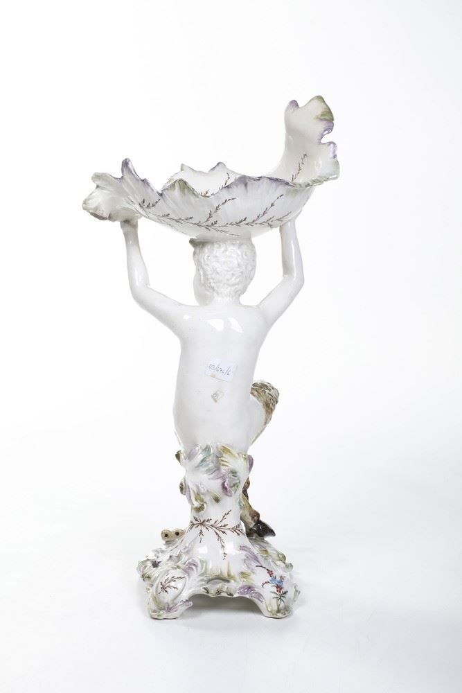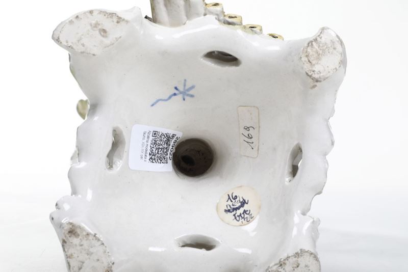 Terraglia decorata in policromia. Marca: "asterisco a cometa" in blu. Altezza cm 47. Conservazione: restauri nella parte superiore della conghiglia.