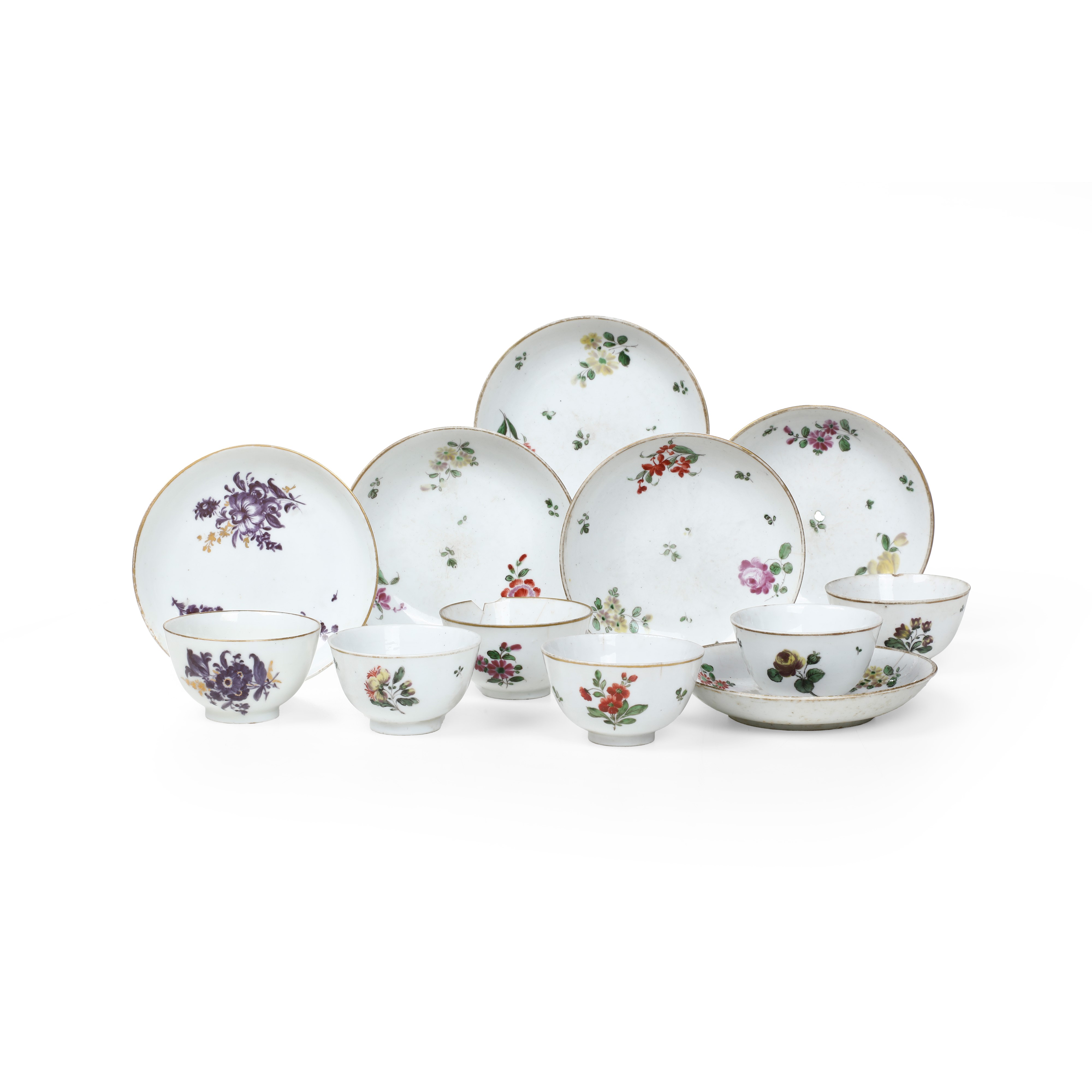 Porcellana. Marca: ancora in rosso. Dimensioni: altezza tazza cm 4 circa; diametro piattino cm 11,8 circa. Conservazione: tazze con usure all’oro, un pezzo con sbeccatura la bordo supeirore, tre pezzi con felatura e piccole sbeccature; piattini con usure all’oro e un pezzo con felatura