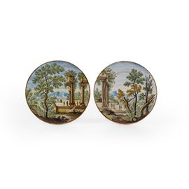 I piatti sono decorati in policromia a gran fuoco con ampi paesaggi a rovine architettoniche e coppie di viandanti.