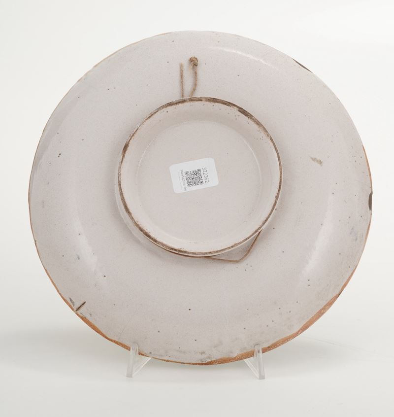Maiolica. Marca: assente. Diametro cm 29. Conservazione: sbeccature e salti di smalto al bordo; insignificante fealtura.
