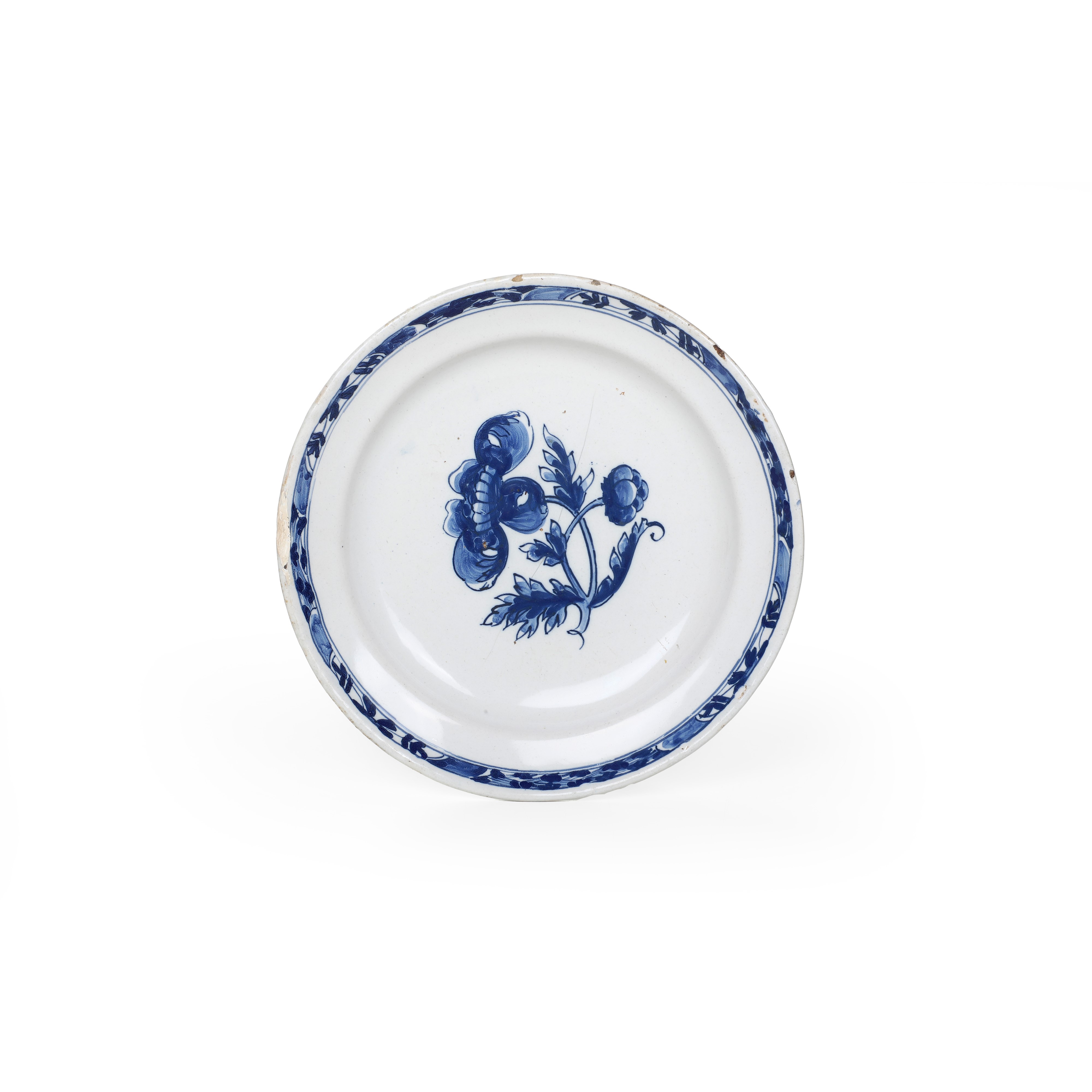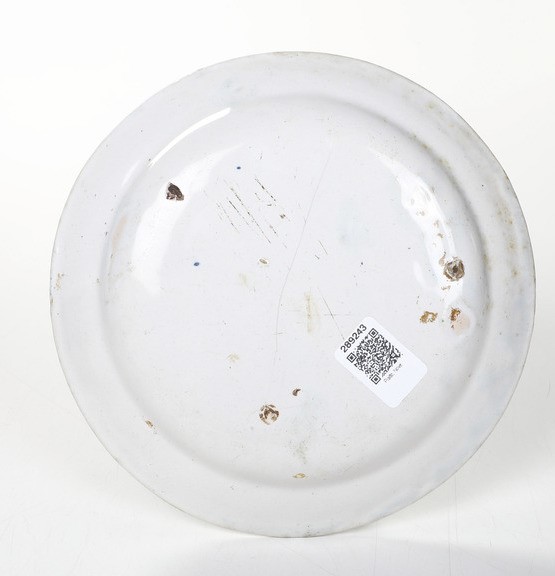 Maiolica. Marca: assente. Diametro cm 23,4. Conservazione: sbeccatura e salti di smalto minori al bordo; insignificante felatura nel cavetto.