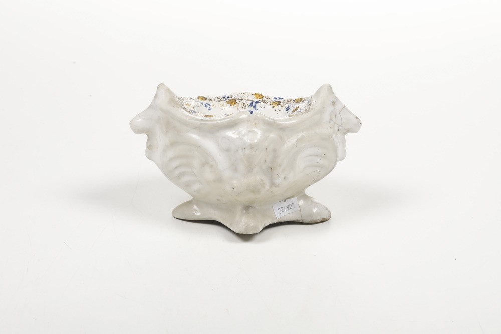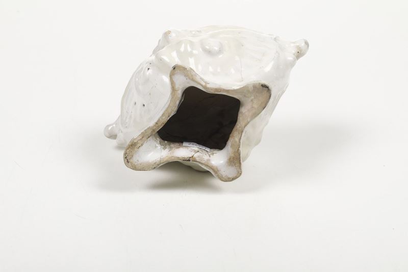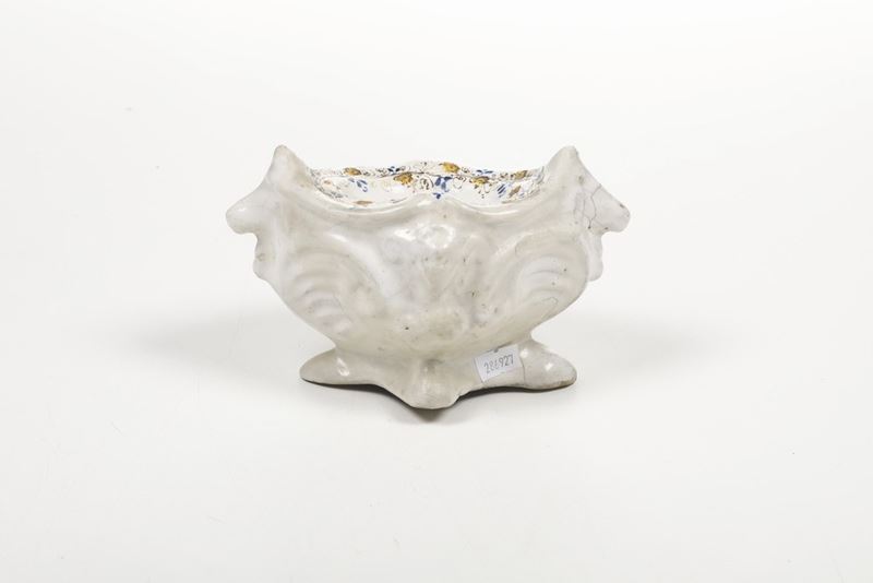 Maiolica. Marca: assente. Dimensioni: altezza cm 10,5; 17,5x10. Conservazione: restauri; una felatura restaurata e craquelures.