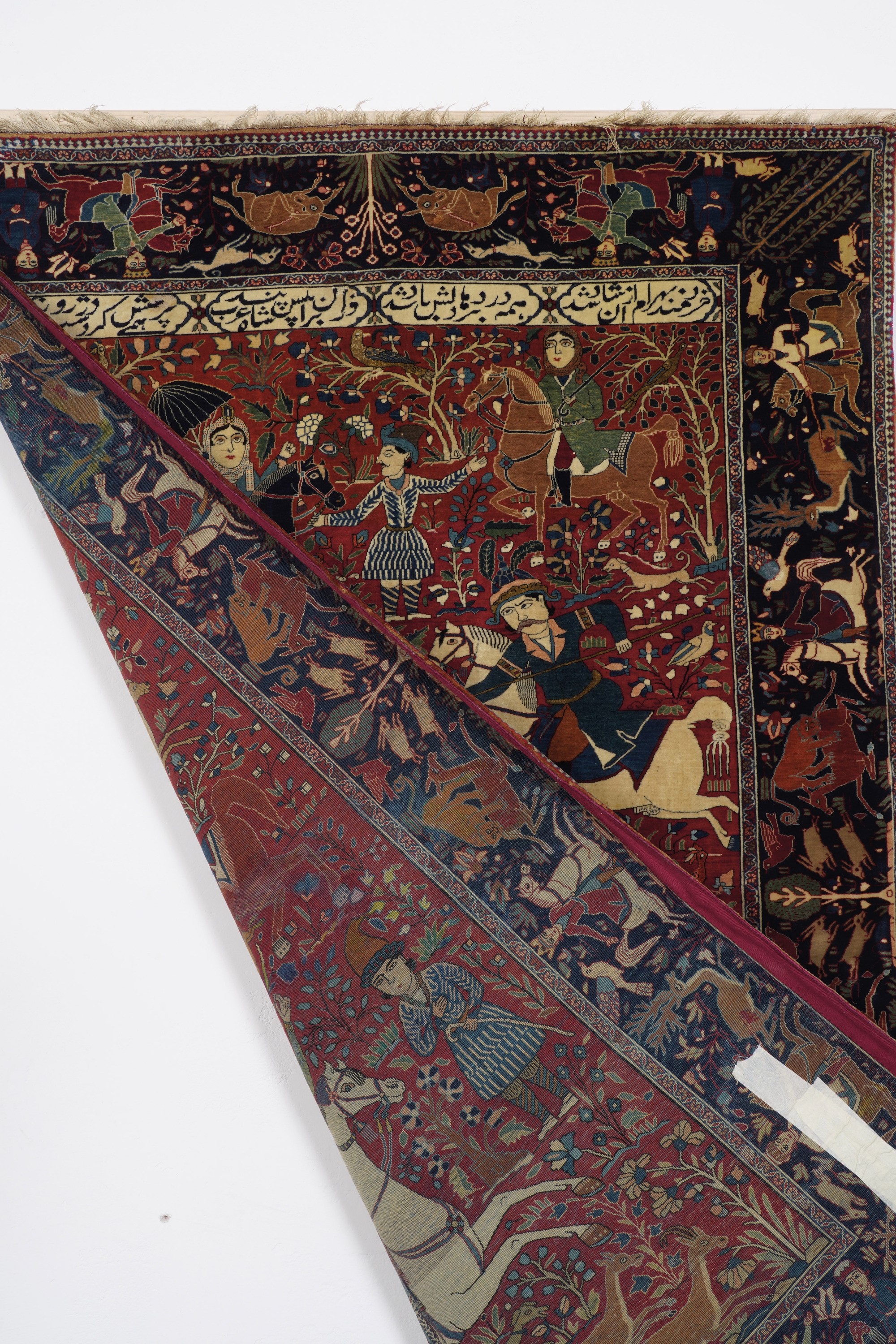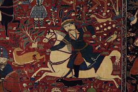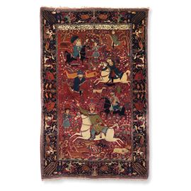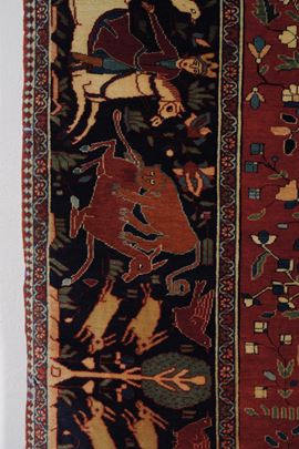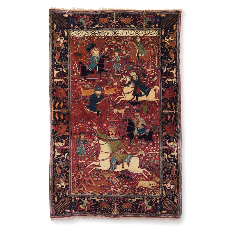 tappeto figurativo con scene di caccia, iscrizione nella testata superiore.