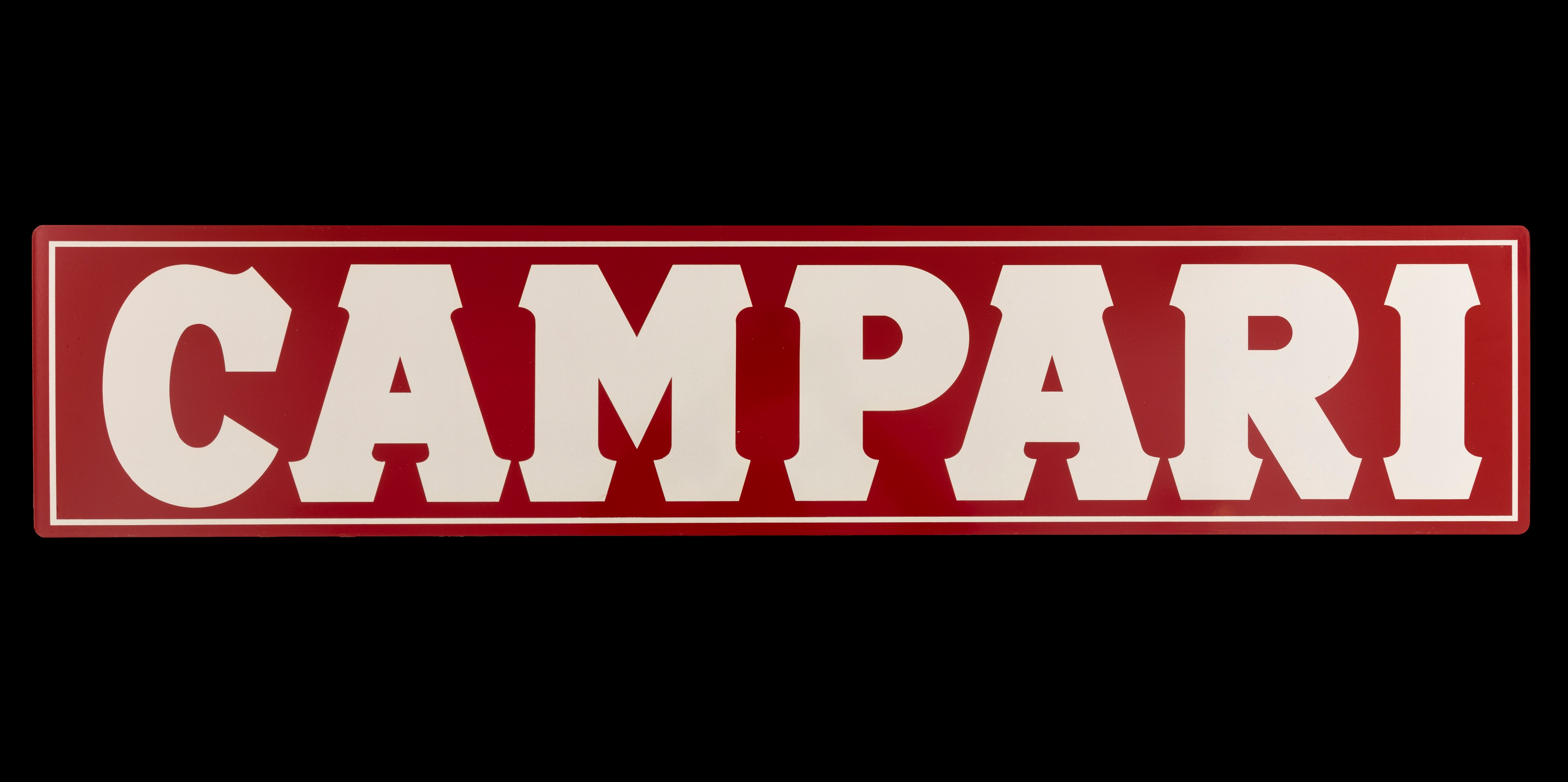 Insegna serigrafiata su latta, 1980. Cm 25 x 120,5. Qualità A