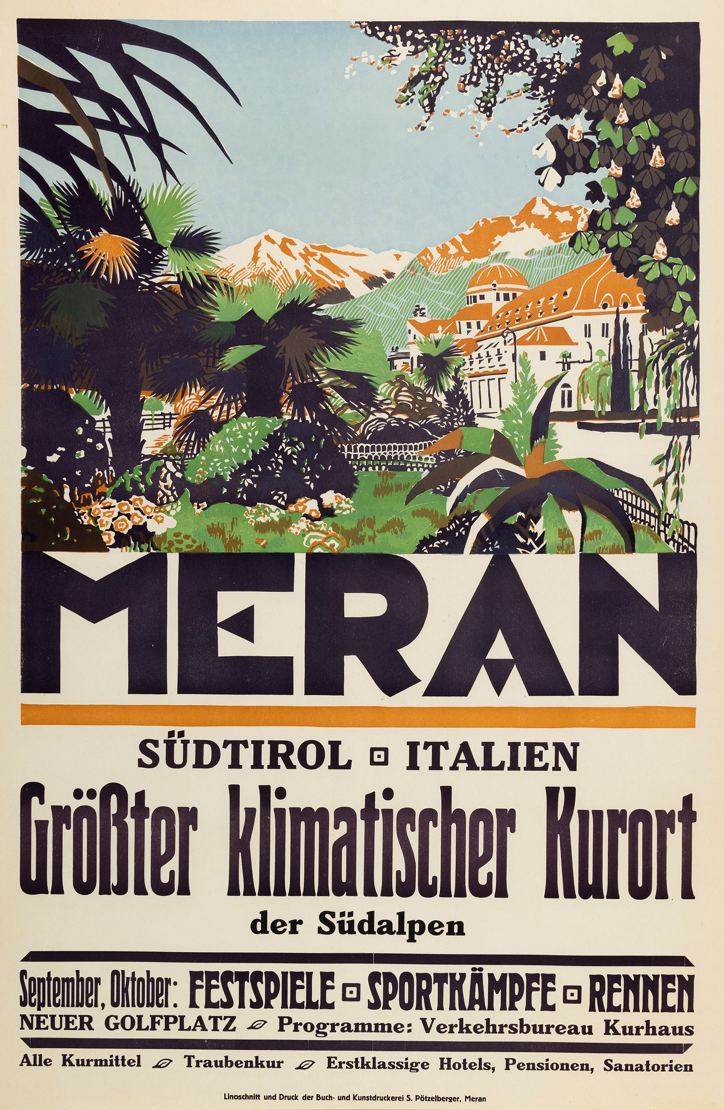 Affisso litografico, 1930. Impresso da S. Potzelberger, Meran. Cm 95 x 62,5. Qualità A-