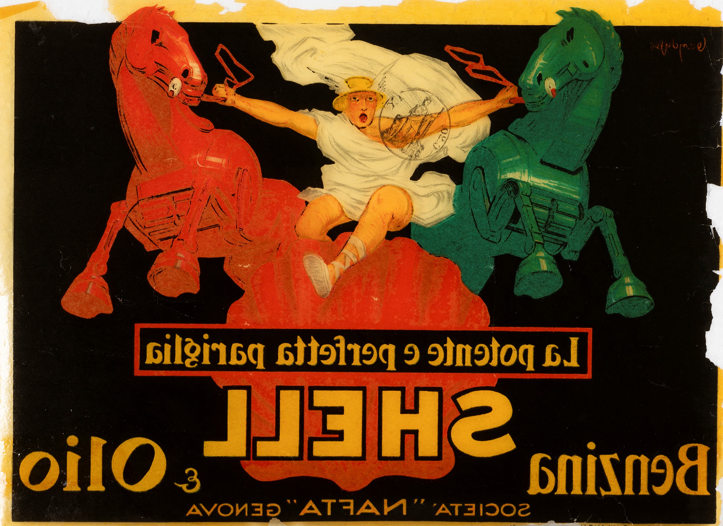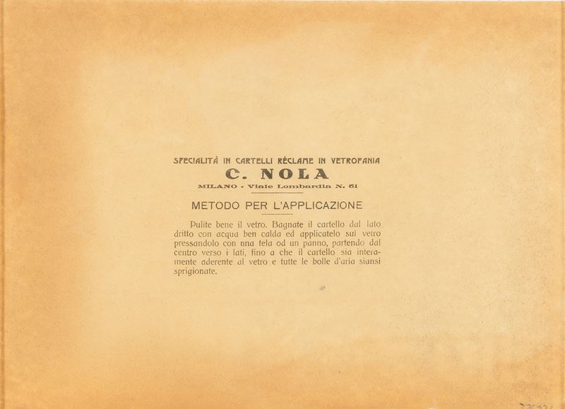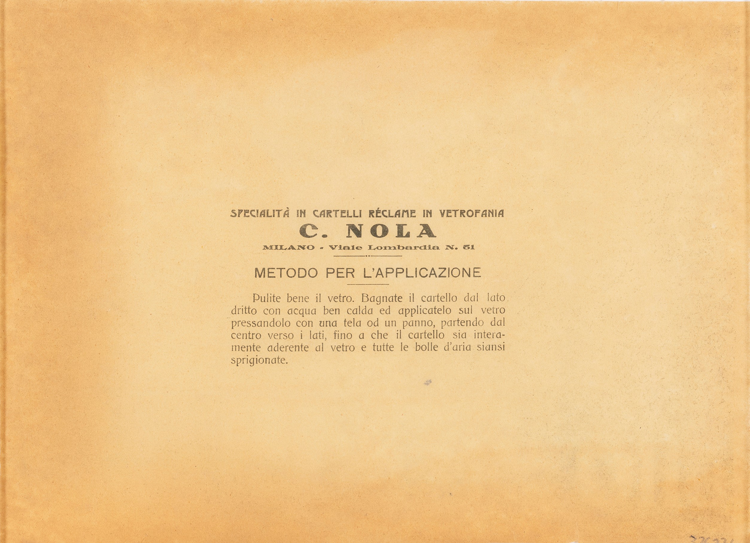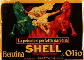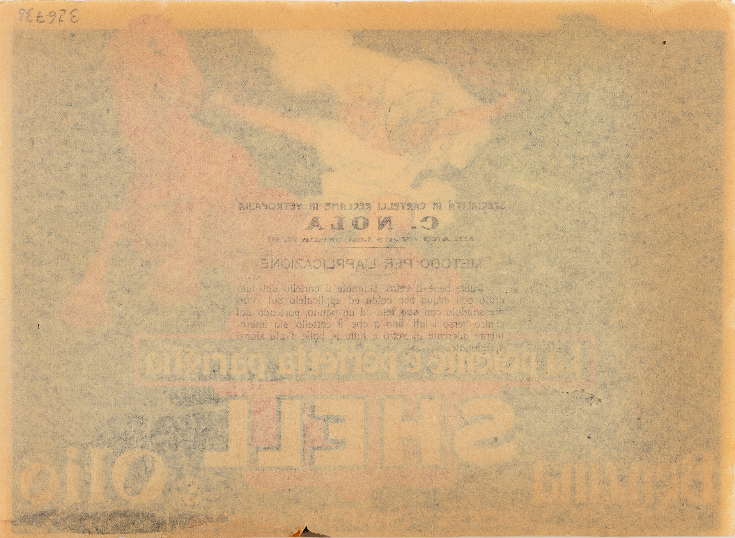 Coppia di locandine litografiche su carta con retro adesivo, 1927 ca. Impresso da Società Nafta - Genova. Cm 24,5 x 33. Qualità B+