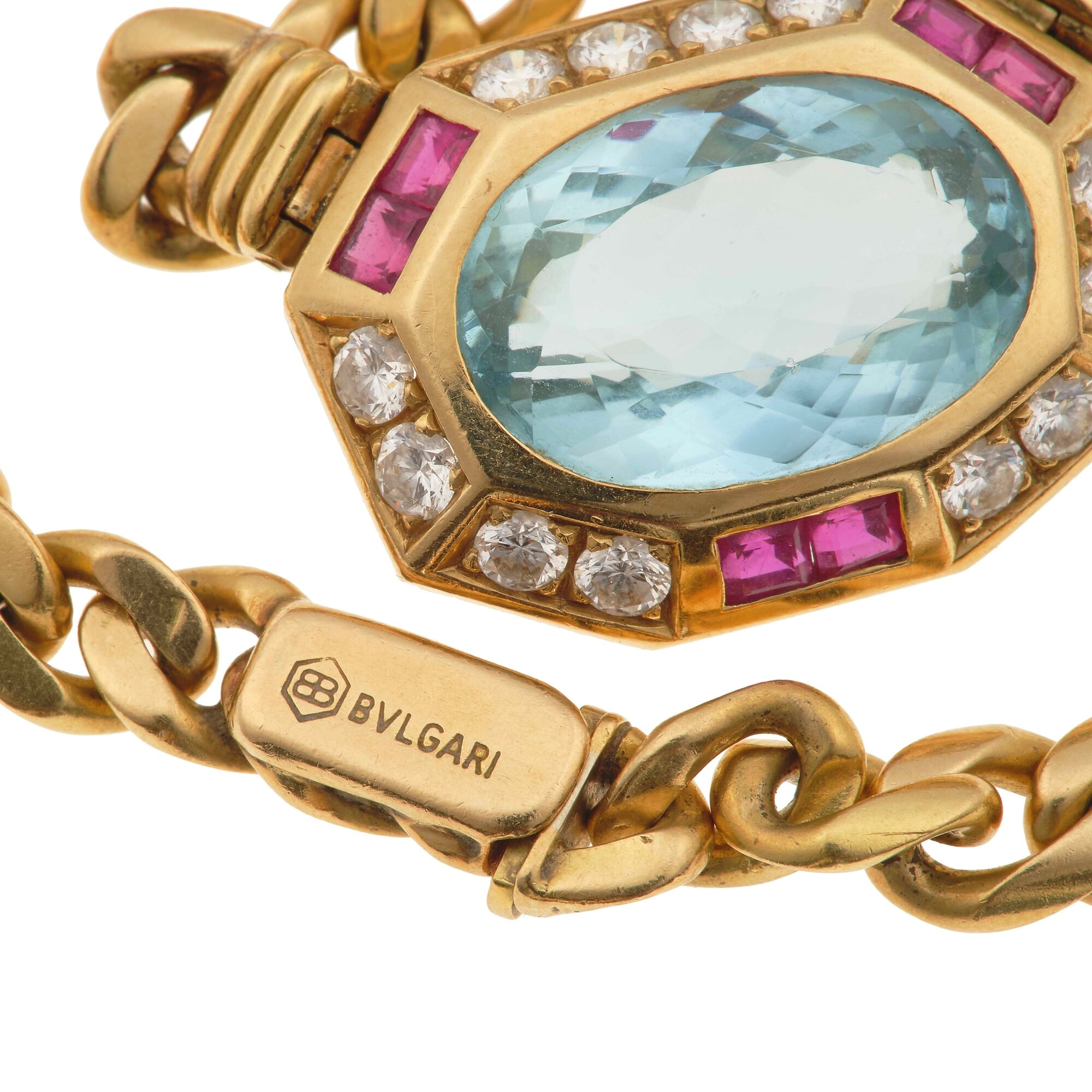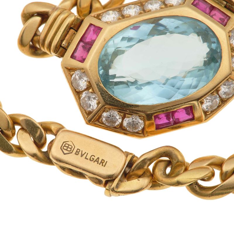 Aquamarine, diamond, ruby and gold necklace. Signed Bulgari