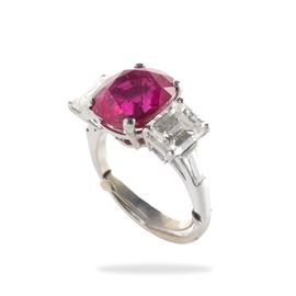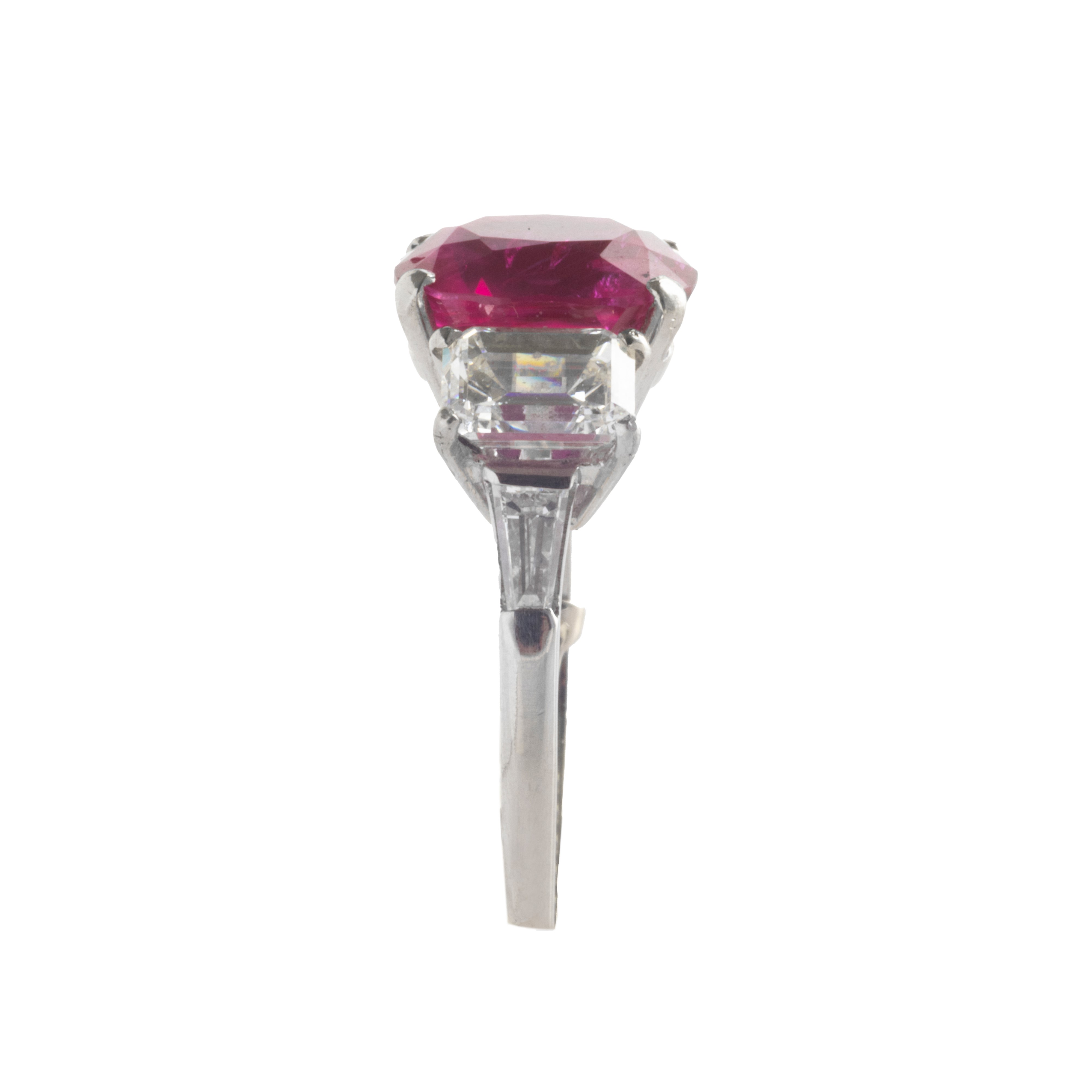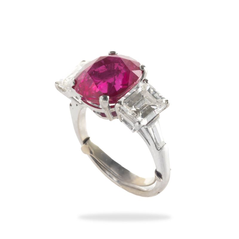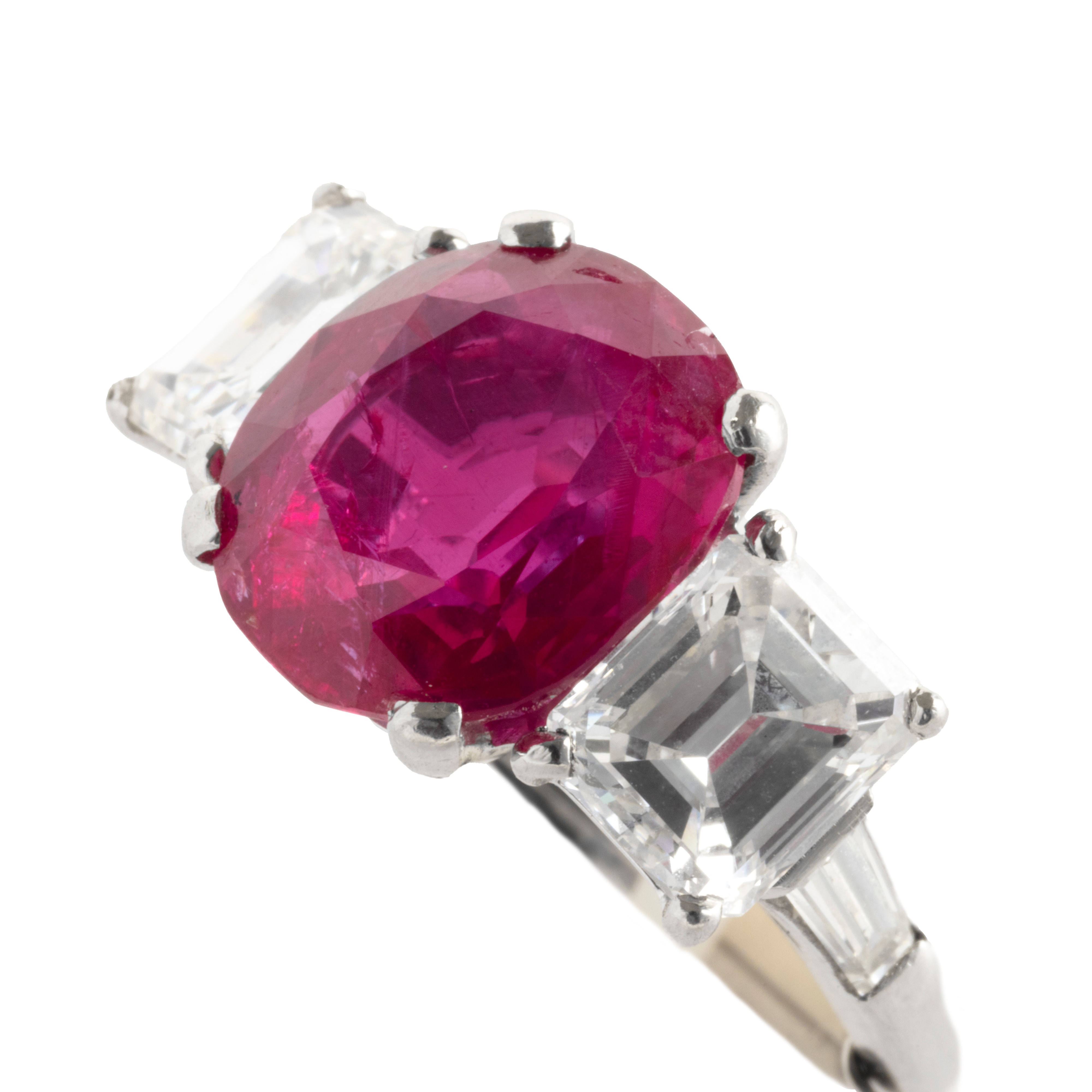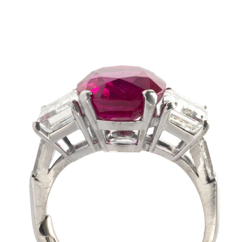Burma ruby weighing 5.16 carats, with no indications of heating, and two emerald-cut diamond ring