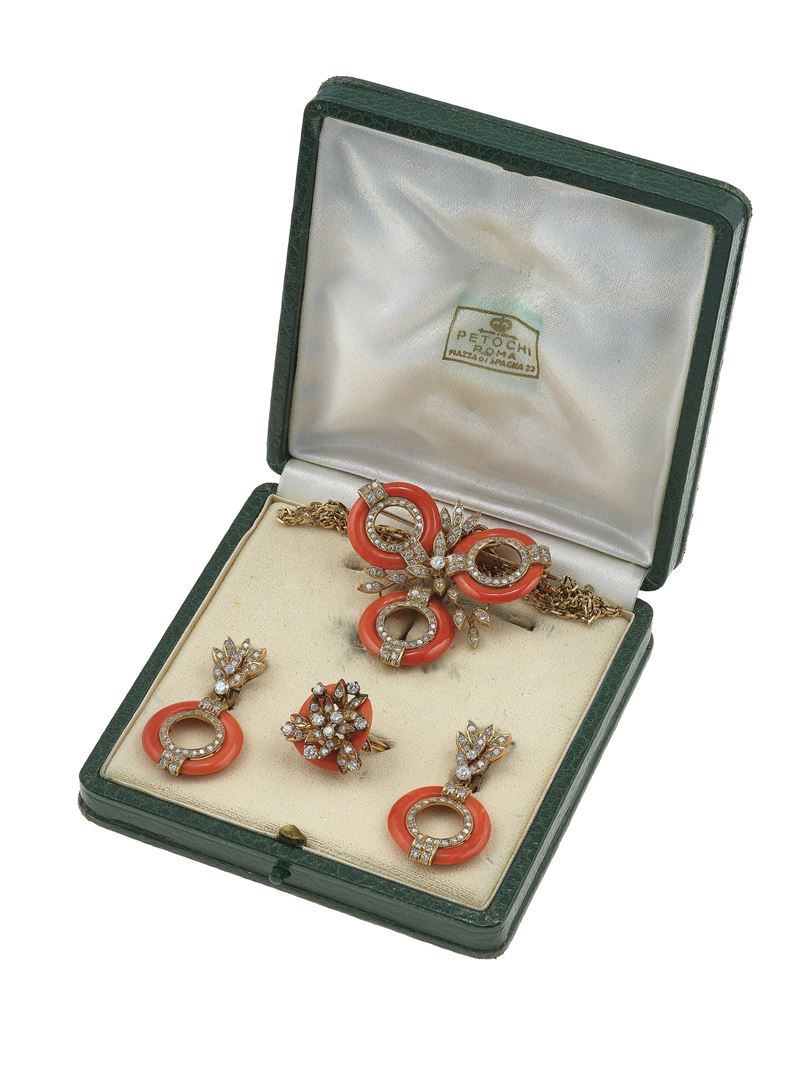 Coral, diamond and gold parure. Signed Petochi. Fitted case
