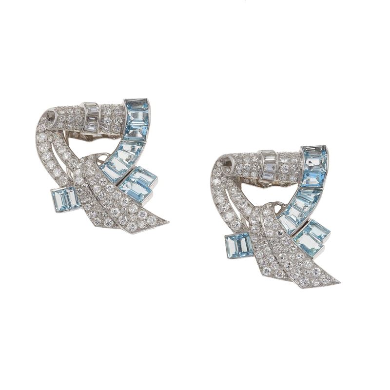 Diamond, aquamarine and platinum double clip brooch. Numbered 1469