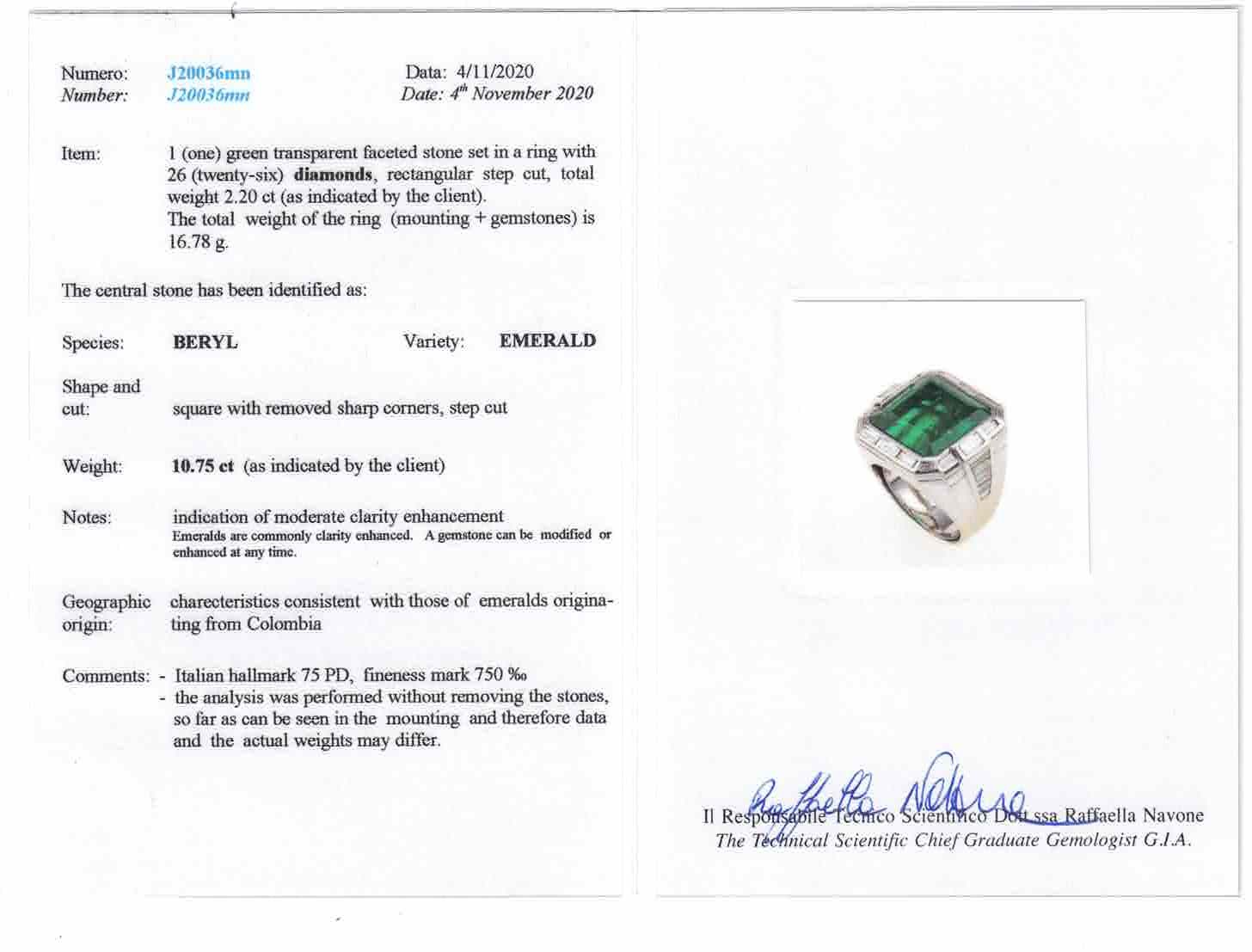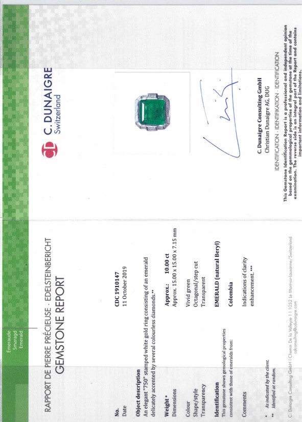 Emerald and diamond ring. Gemmological Report C. Dunaigre n. CDC 1910147, R.A.G. Torino n. J20036mn, LFG n. 408666