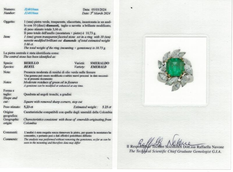 Emerald, diamond and gold ring. Gemmological Report R.A.G. Torino n. J24010mn