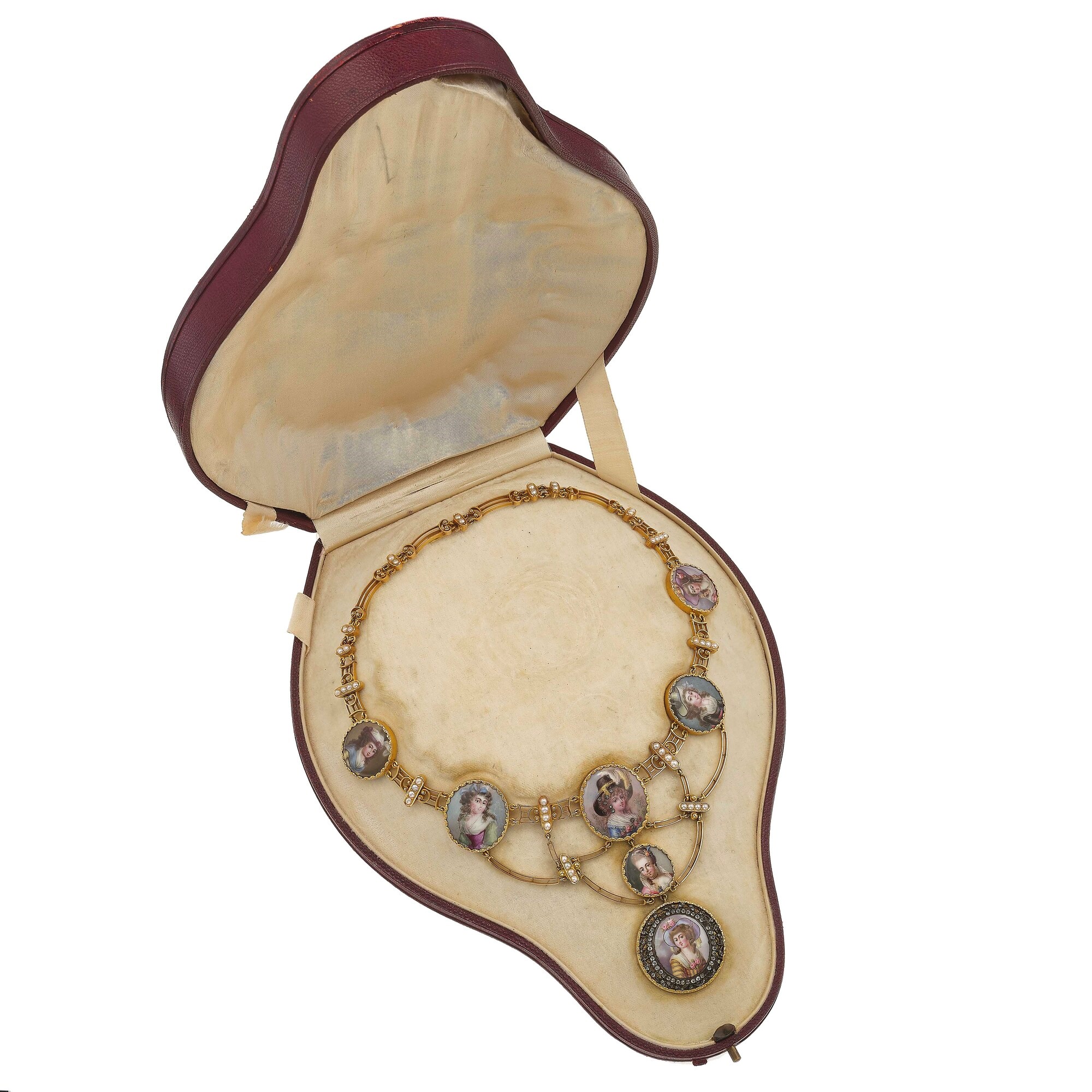 Enamel, pearl, diamond, gold and low-karat gold necklace. Damage