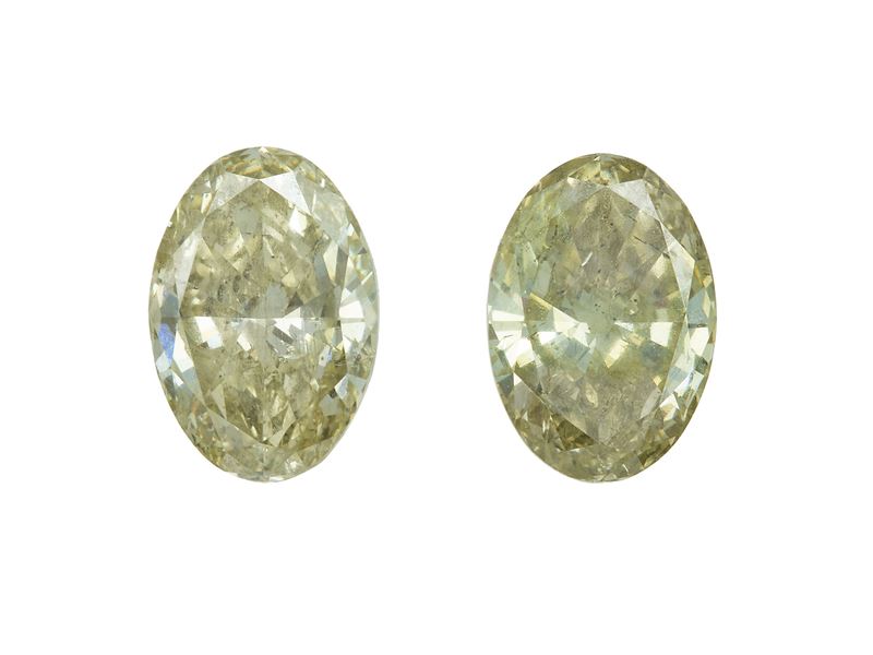 Natural fancy yellow-grey diamonds weighings 4.07 and 4.14 carats and gold ring