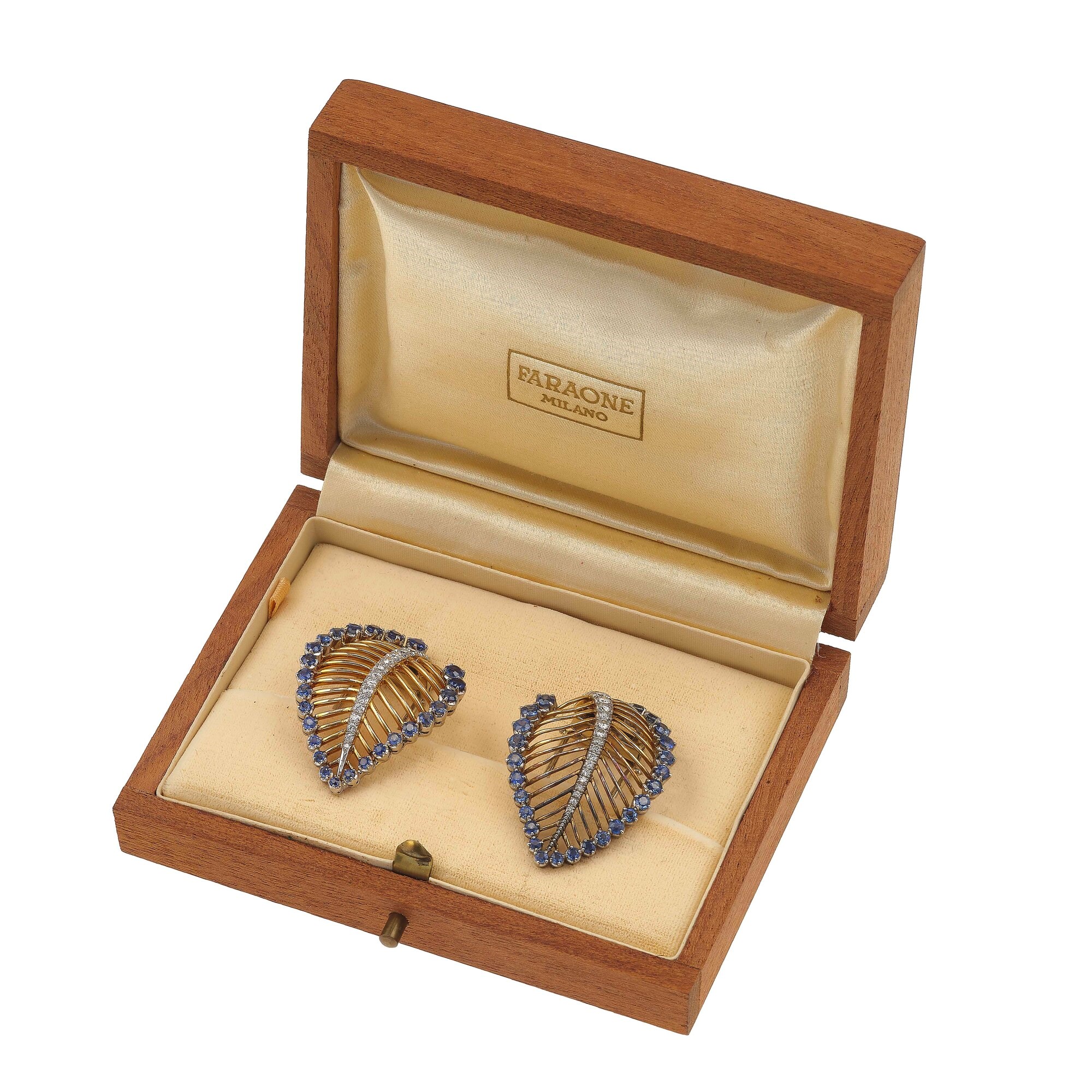 Pair of sapphire, diamond and gold clips. Signed Faraone. Fitted case