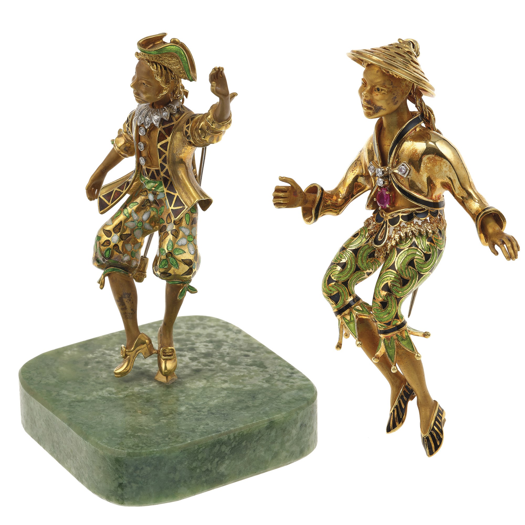 Two diamond, enamel and gold figurines. One with base. The two figurines can be worn as brooch