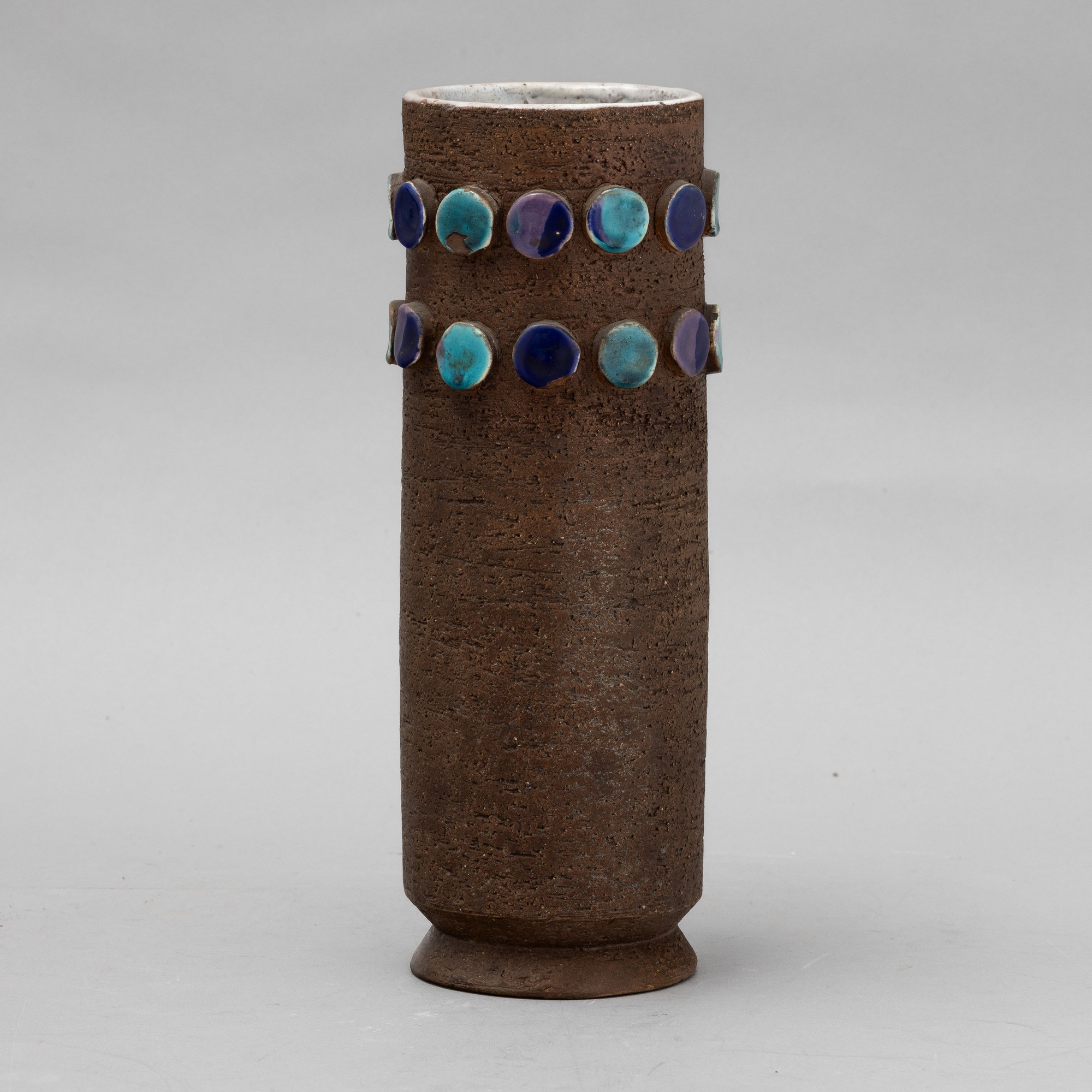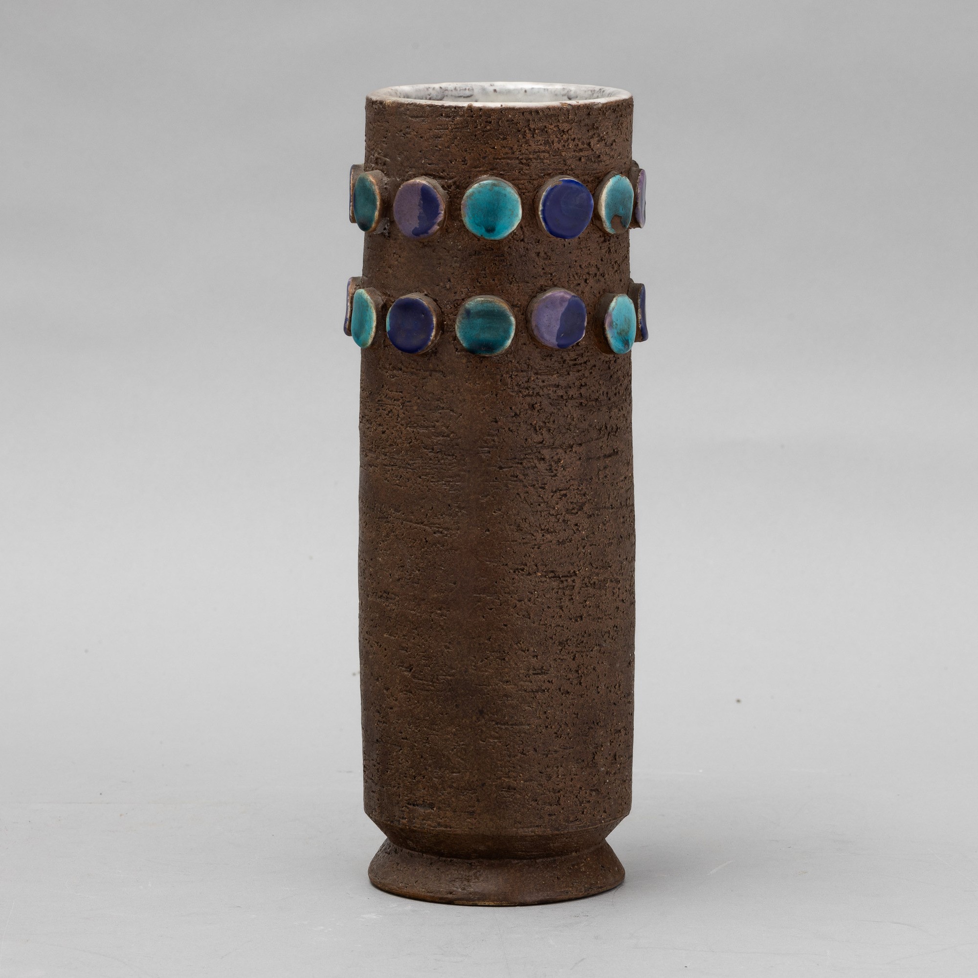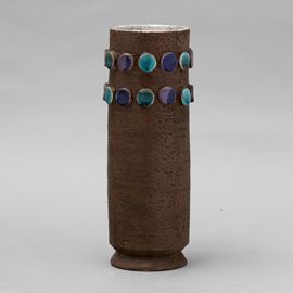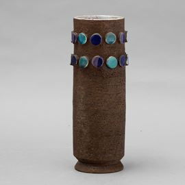 A refractory red clay vase with polychrome maiolica roundels. Series number present