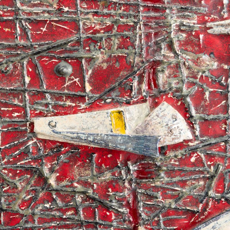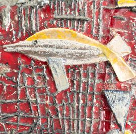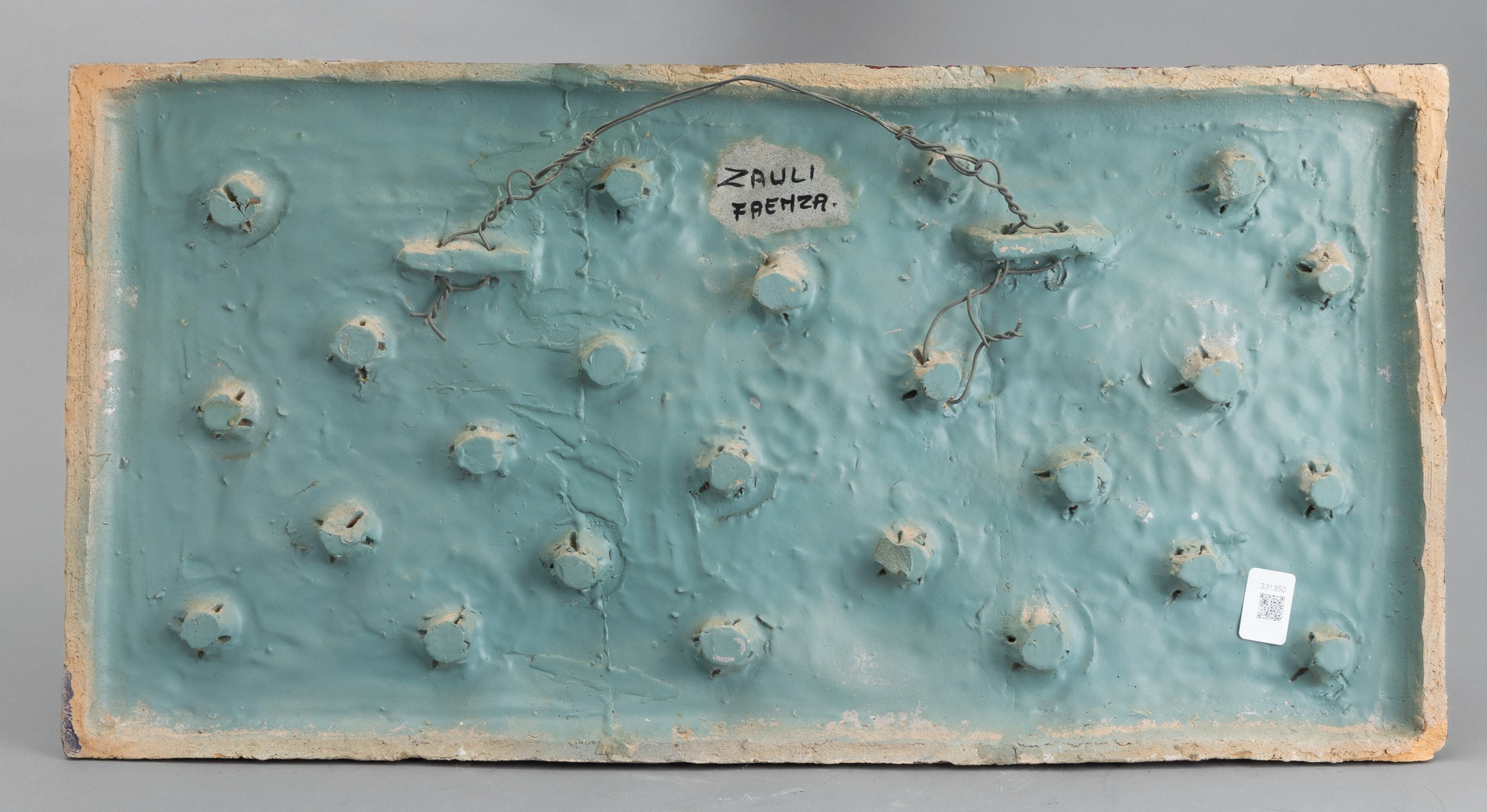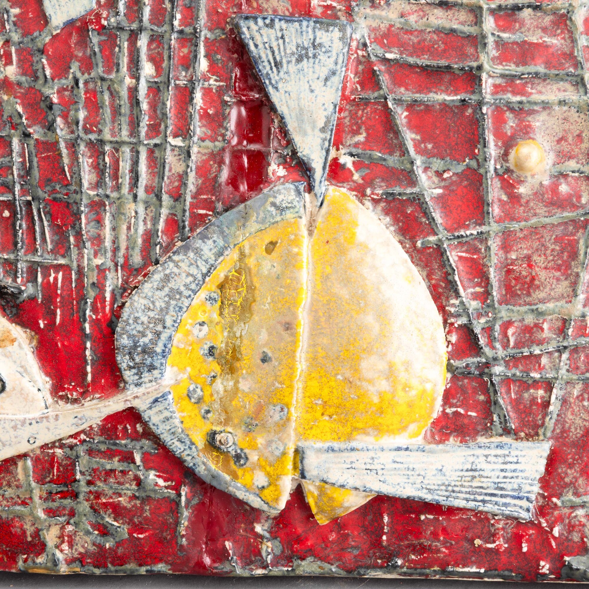 A majolica-tiled terracotta plaque with an embossed abstract marine decor. Author's signature