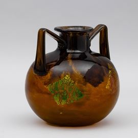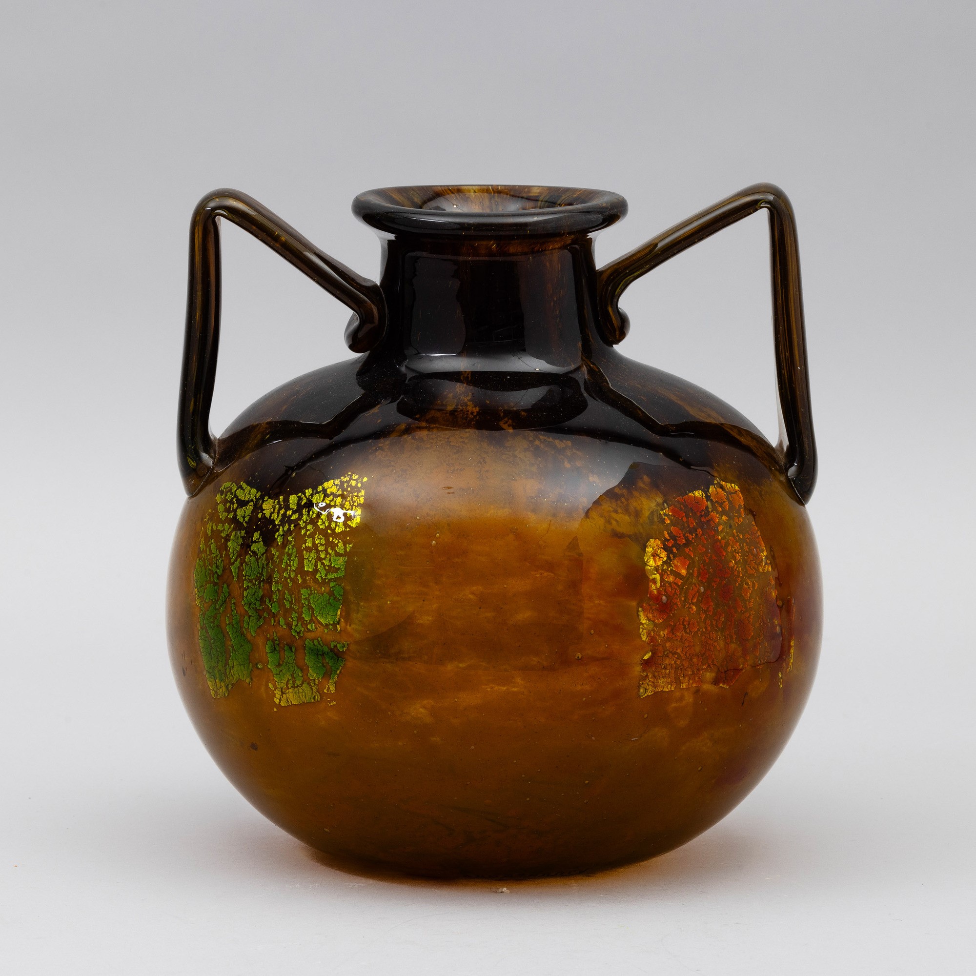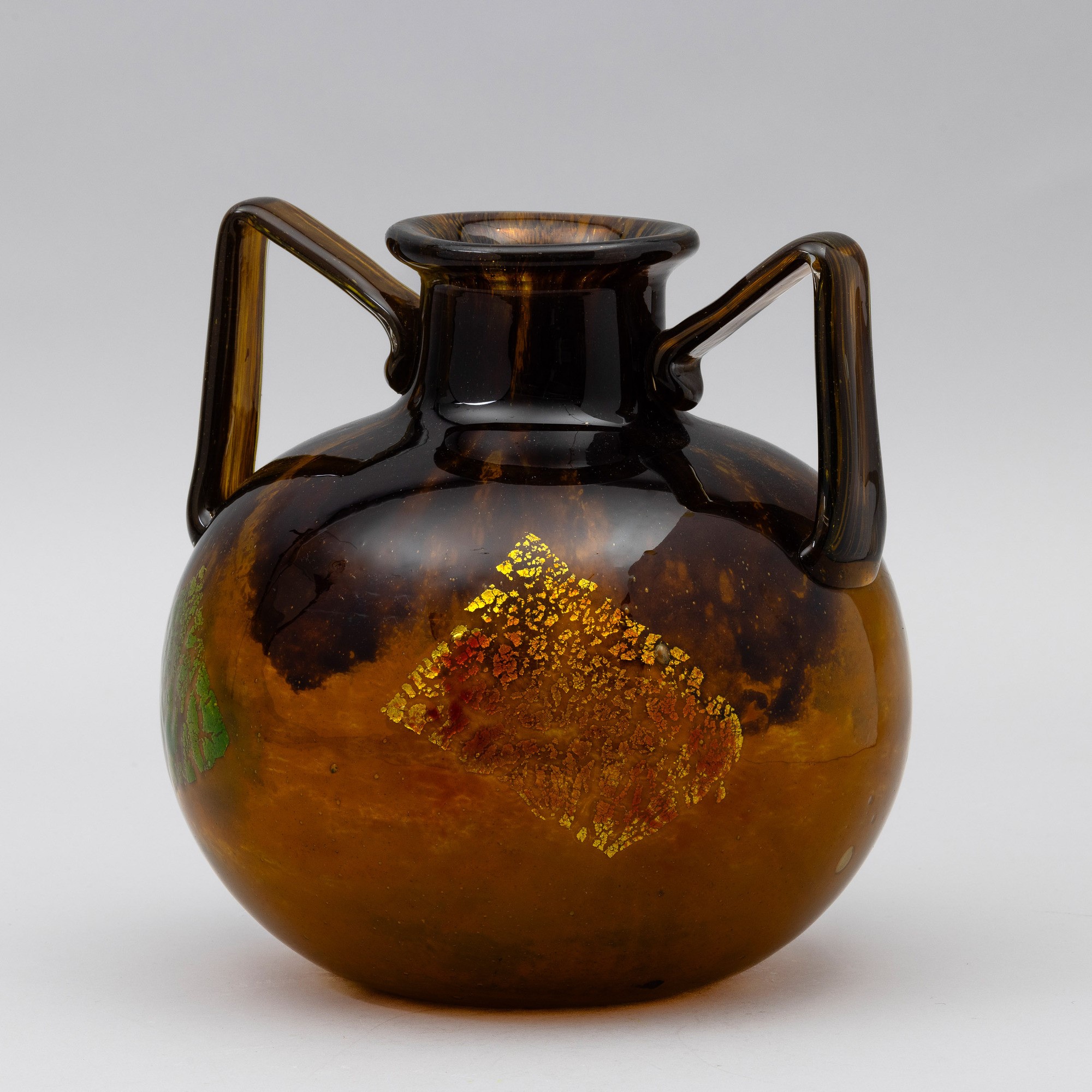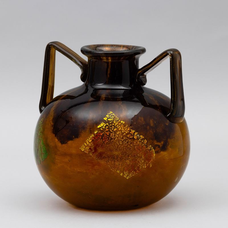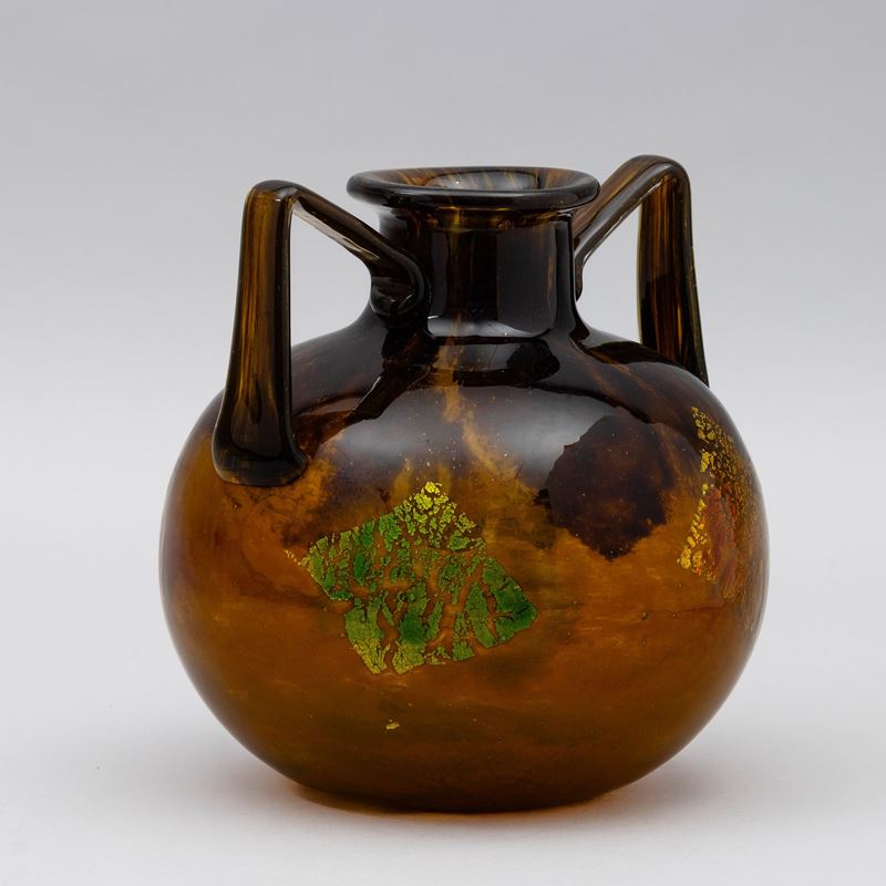 A blown glass vase with a polychrome decor and submerged gold leaf. Engraved signature Daum Nancy