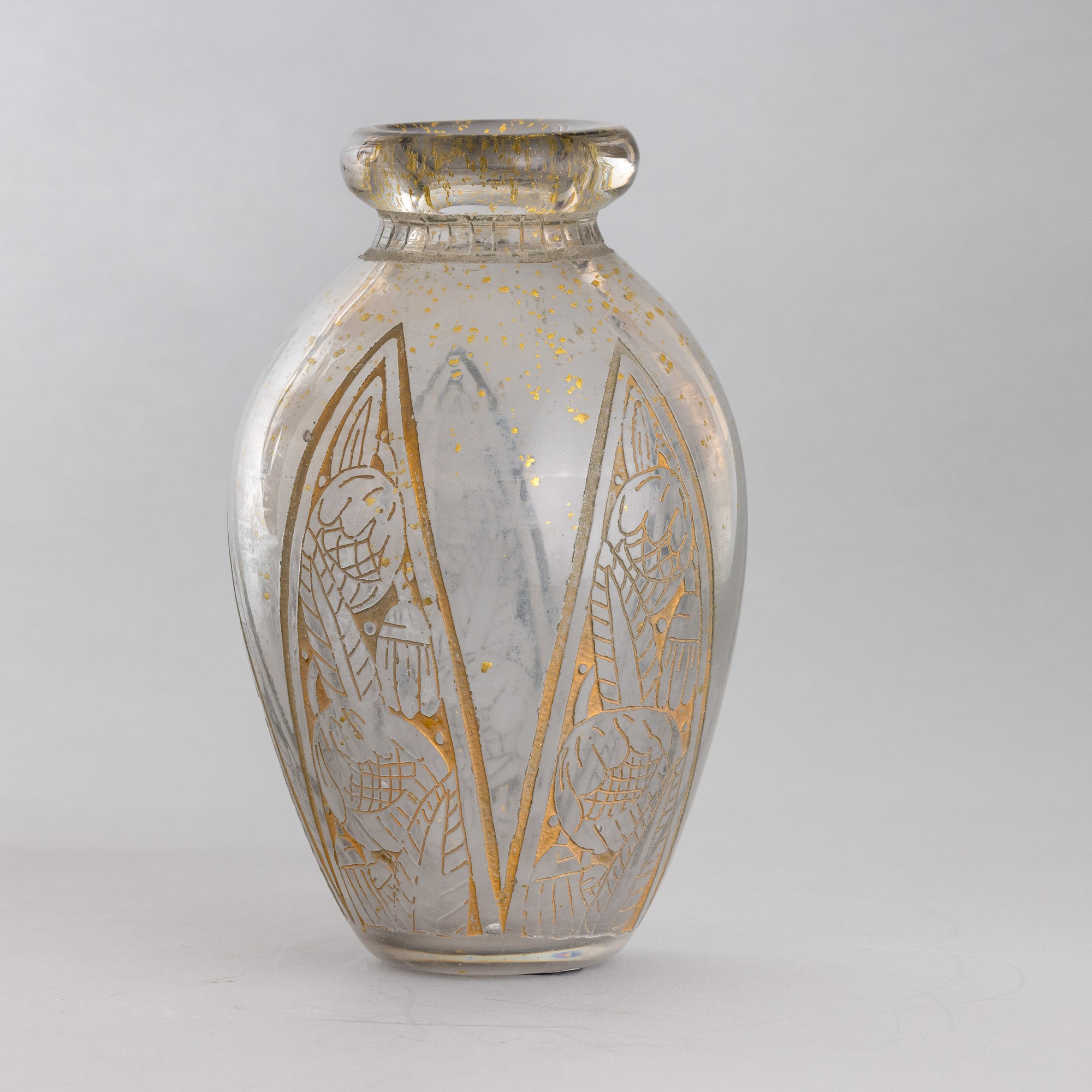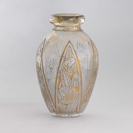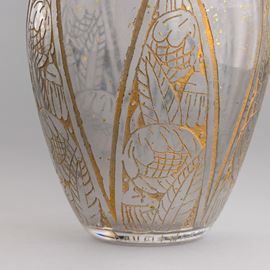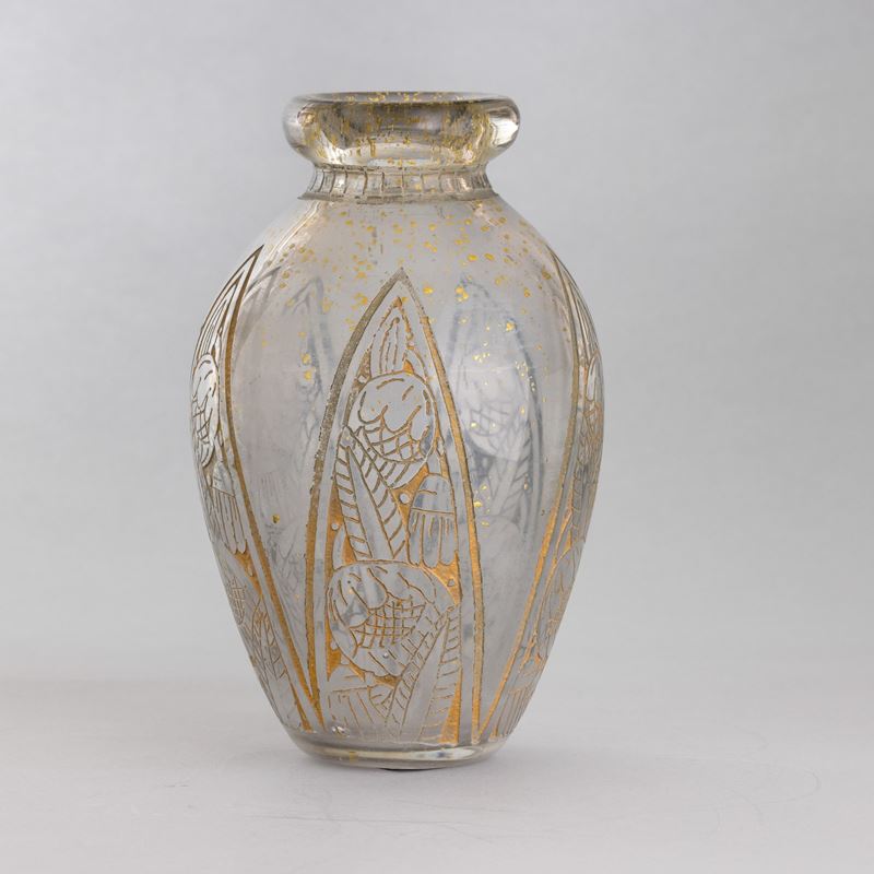 A corroded glass vase with an engraved decor and submerged gold leaf. Engraved signature